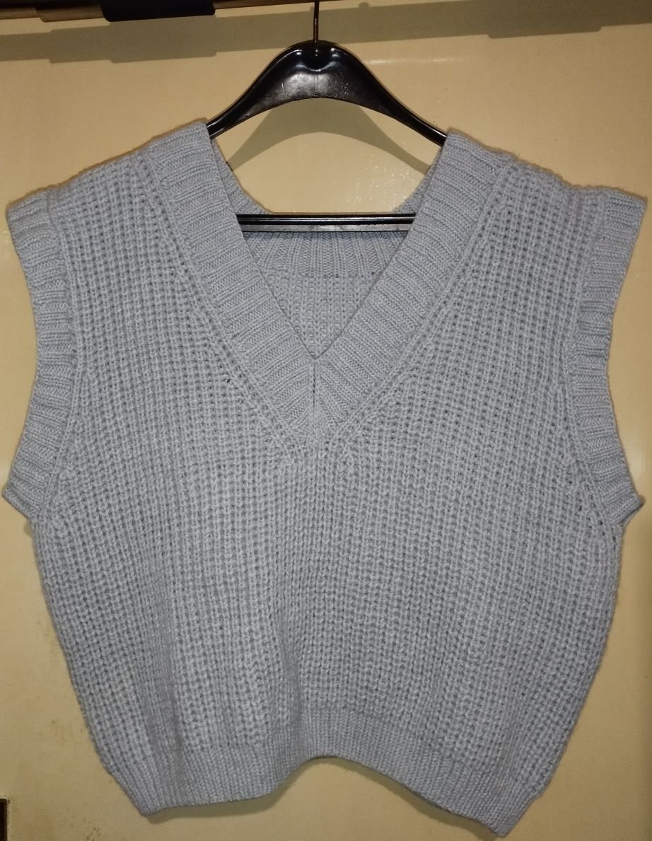 До сега не бях плела английски ластик на дреха, при това комбинация от плетене в кръг и плетене ляво/дясно, което ми създаде известни затруднения. За пръв път плета и V-обрзно деколте.
