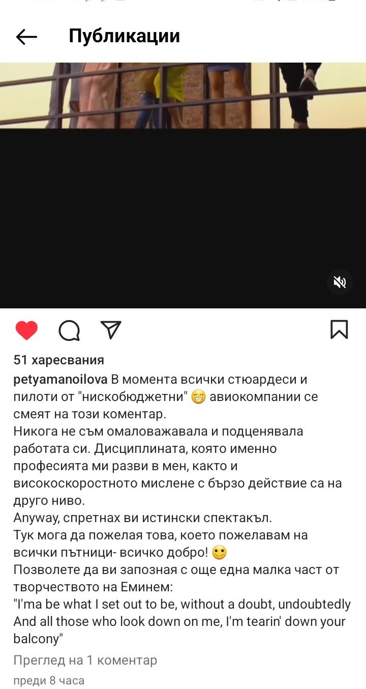 Оставих и аз един коментар в Инстаграма. Валя ми е страшно антипатична напоследък с дребнавите и нагли коментари. Дано скоро си отиде, защото не я понасям и нея вече. Аман. Нискобюджетна компания, ало, тая дропла въобще знае ли колко пари и труд и знания се искат да станеш пилот на самолет или стюард / стюардеса! Аман от наглеци на тая земя, не оценяващи чуждия труд, инвестиция и време, които дават хората за да се трудят в областта на авиацията. А аз мога да разкажа много за това, защото ми е хоби и съм запознат.
