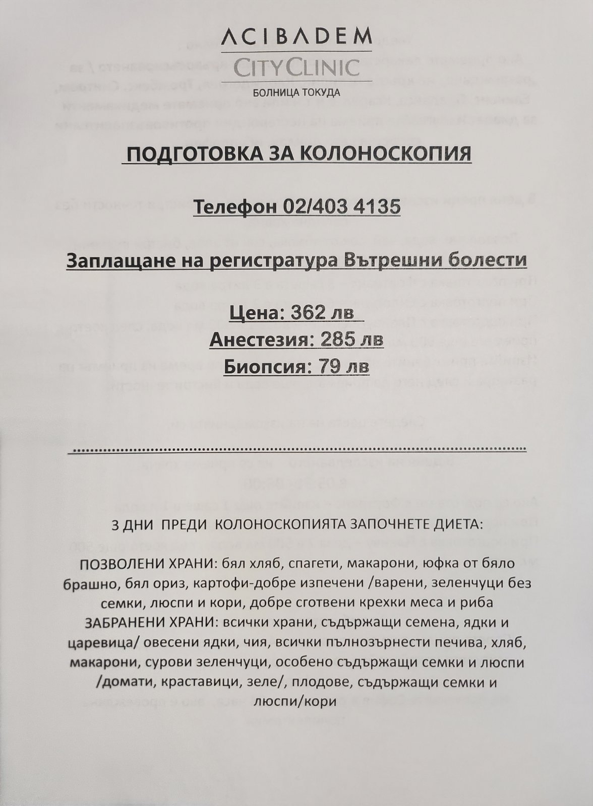 И аз се интересувам от цените, ако някой има скорошен опит. Видях ценоразписа, но още не ми е ясно какво ще е доплащането за двете процедури. Казаха ми, че е необходимо направление за хоспитализация по пътека за колоноскопия, но ще извършат и двете (гастро и колоскопия).