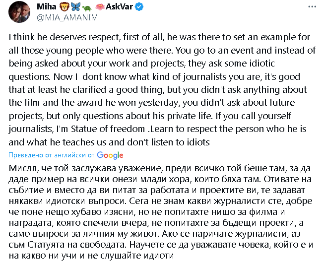 Аз е виждам какво толкова е направила мениджърката му. Керем каквото и да отговори, ще се извърти така че папараците да имат материал за обсъждане. Нормално е тя да се изнервя на такива въпроси, защото в главата си вече вижда утрешните заглавия.