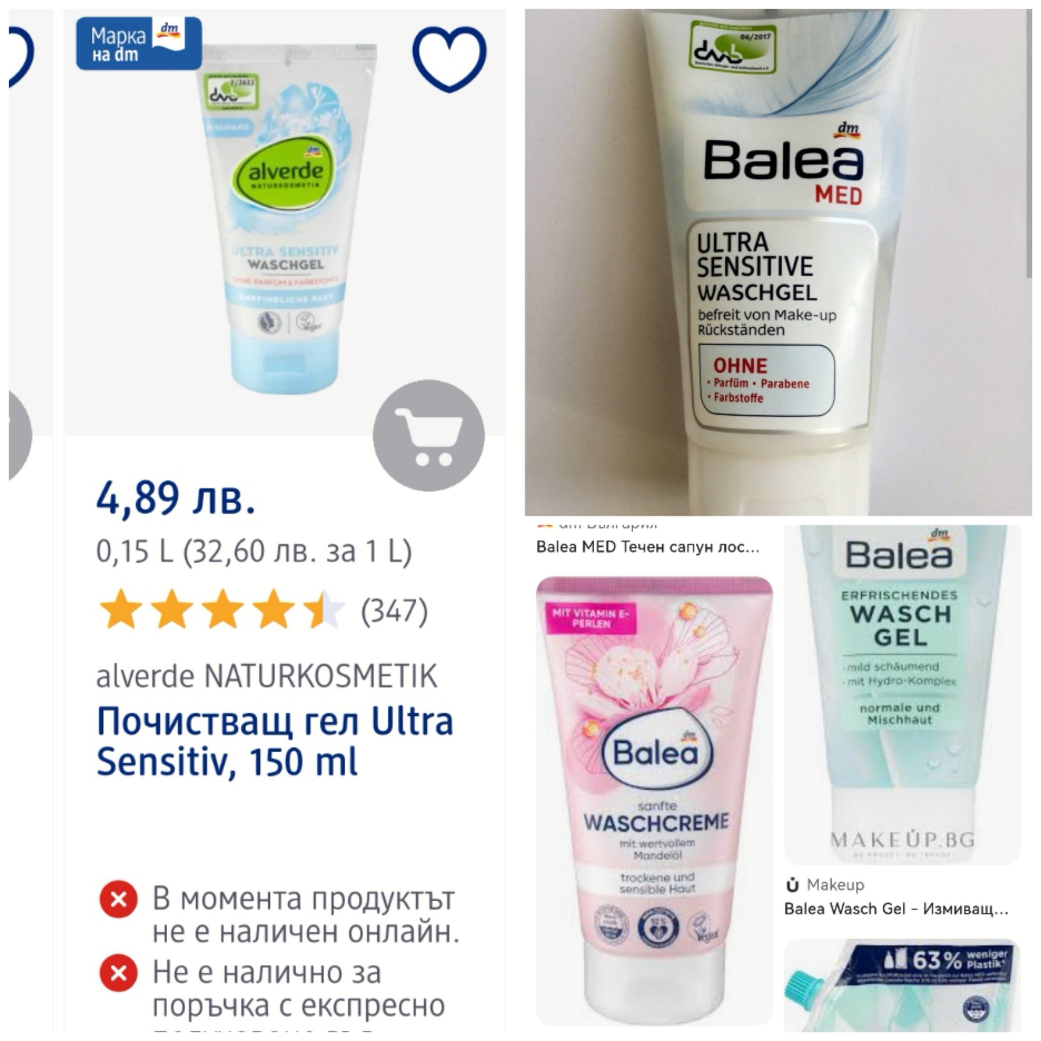 Измивен гел няма - нито на balea, нито на alverde. Моля за препоръки за лек измивен гел за лице, за суха кожа като втора стъпка.