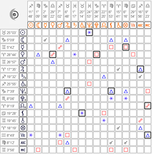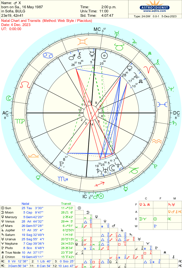 Срещнах го при прогресивна Луна в съвпад с натална и пр Марс отиващ към съвпад с нат уран. Оженихме около 2/3 години по-късно, когато прогр. луна беше точно на мидпойнта на слънцето и луната. Тогава беше и предишния съвпад на Юпитер и Уран (който ще е след няколко месеца) в 7 натален дом.