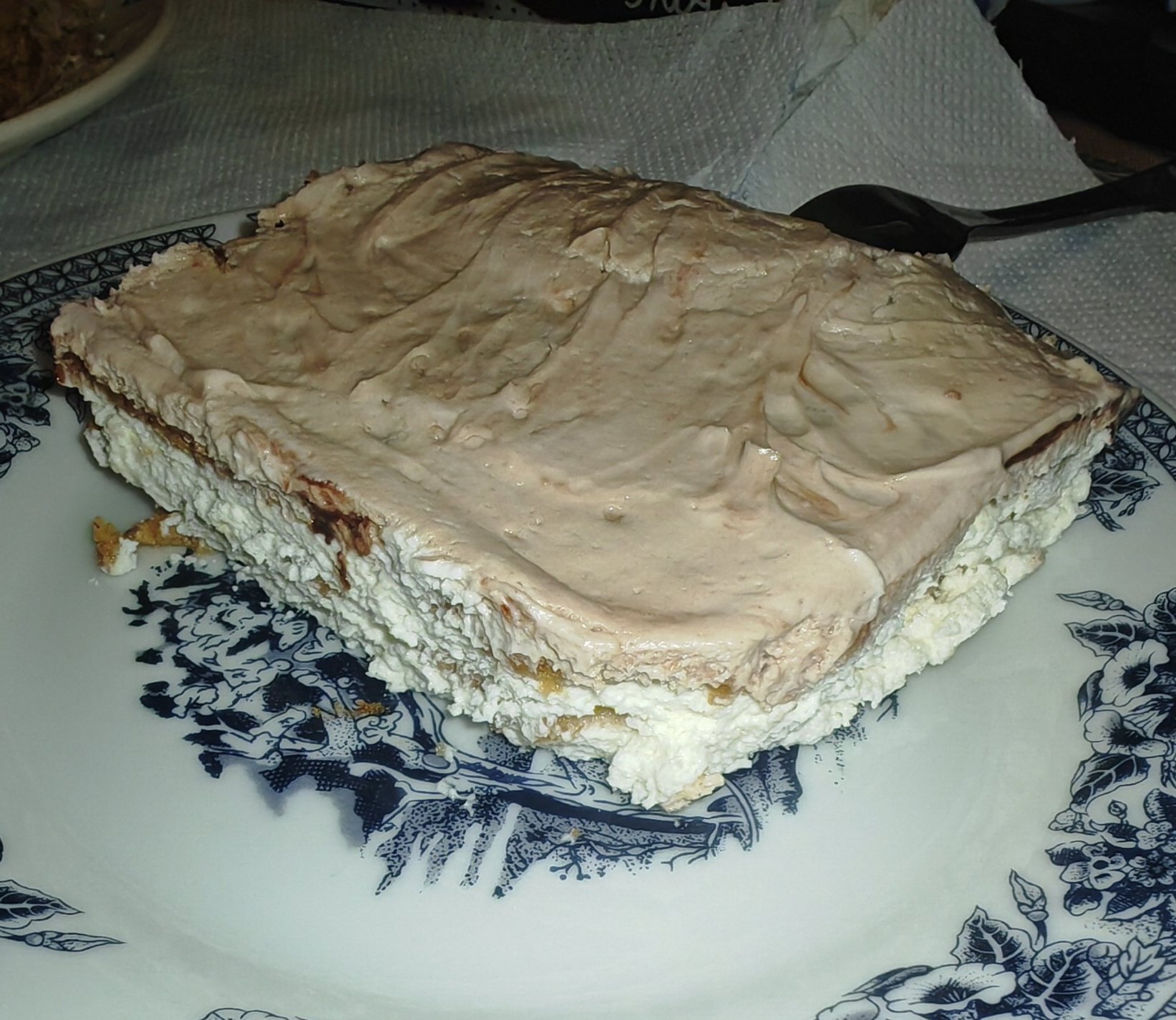 Ред бисквити, ред крем, пръски с течен шоколад и така с три реда бисквити и накрая завършва с крем. Бисквитките ги топя в прясно мляко, но може и в бадемово. Да ви е сладко! ☺️