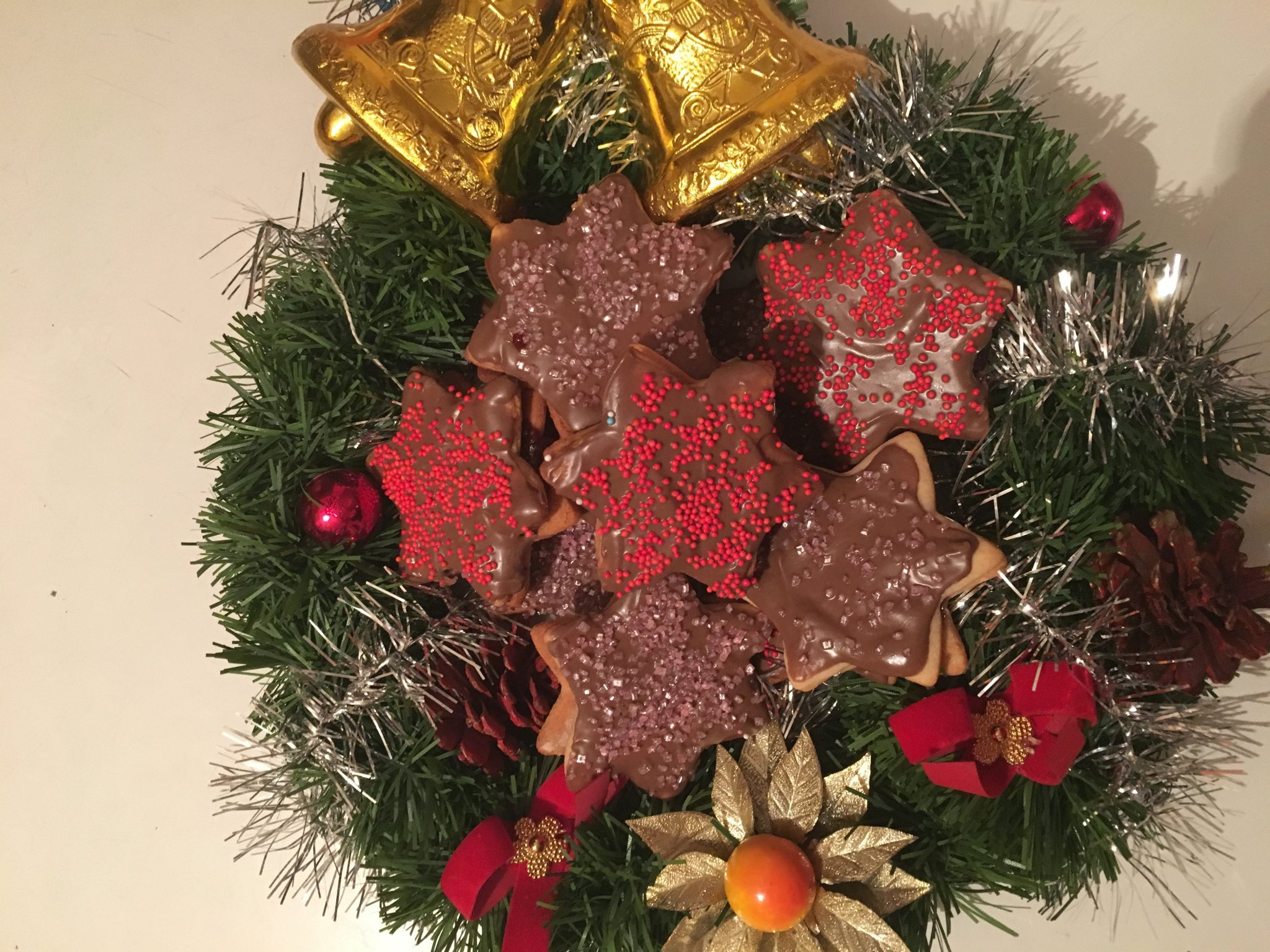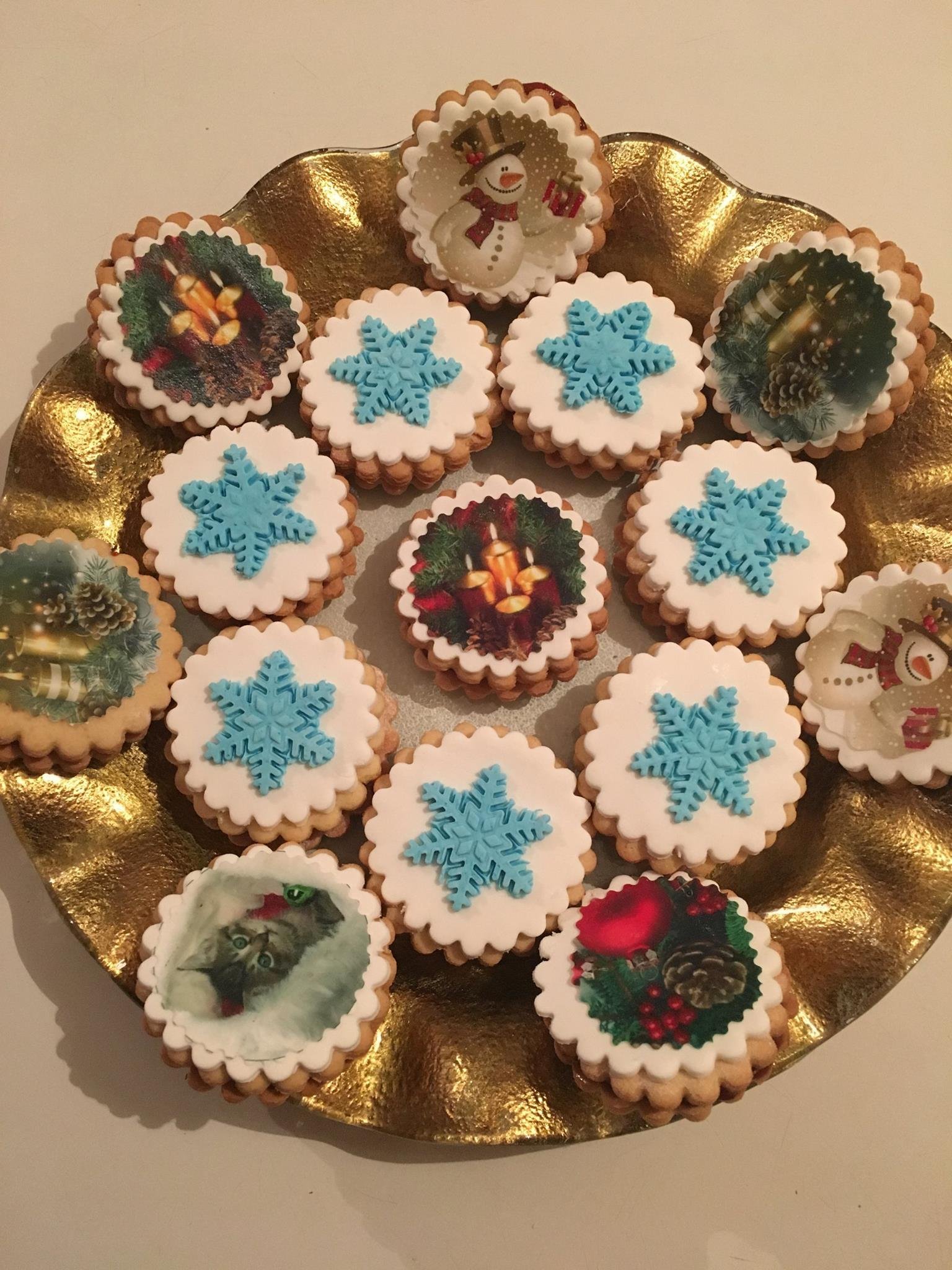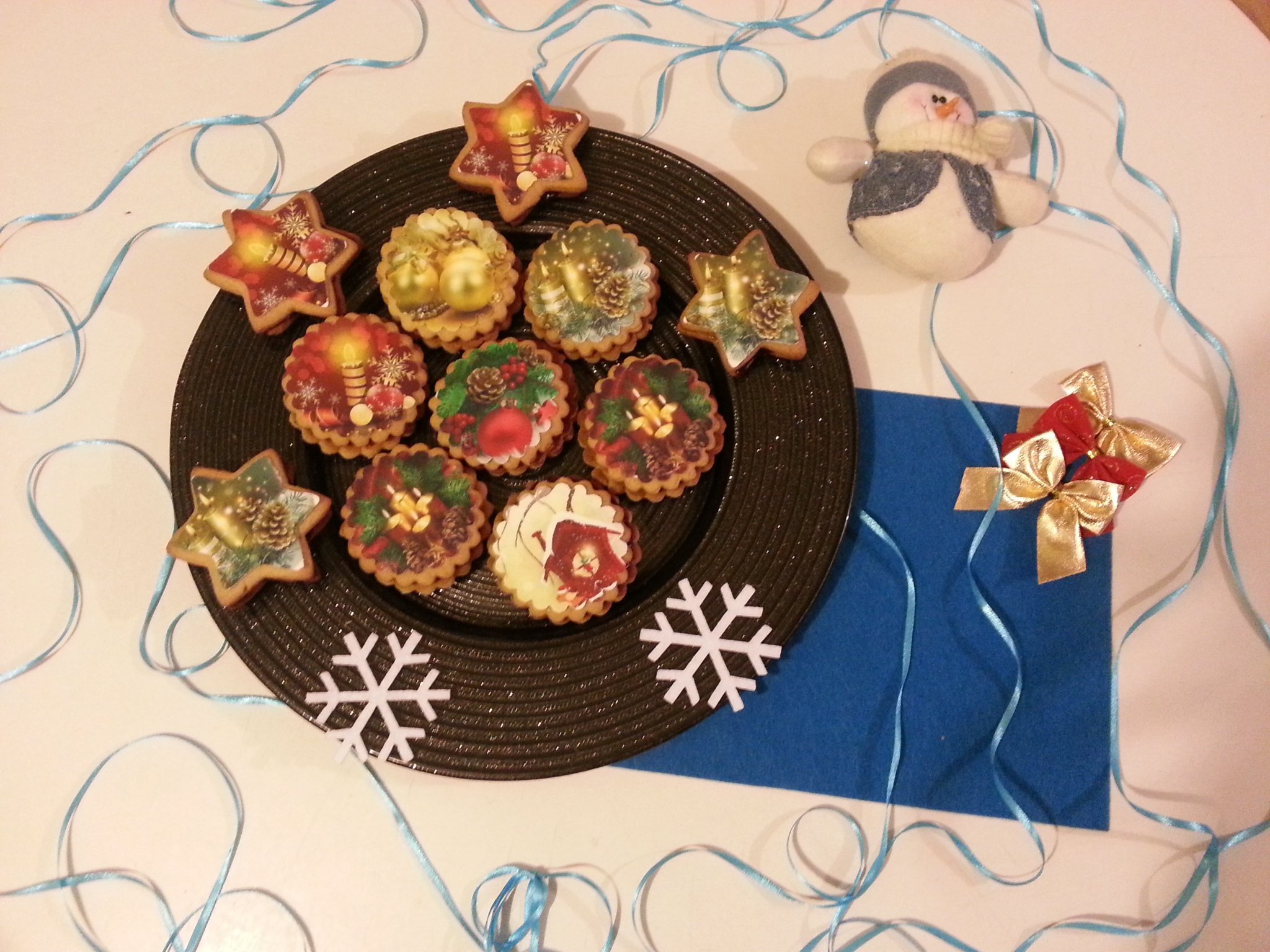 Няколко идеи за украса на меденки. Тези са миналогодишните ми. Всички са слепени с конфитюр. Едните са с кувертюр и захарна поръска, другите с фондан и фонданови картинки /тези с фондан са гадни, но аз мразя фондана/ и другите само с фонданова картинка, които са и най-сполучливи, тъй като картинките са тънки и не дъвчеш захарно тесто. Картинките ги изрязвам с формичката с която режа меденките и лепя върху меденката с желатин разтворен във вода.