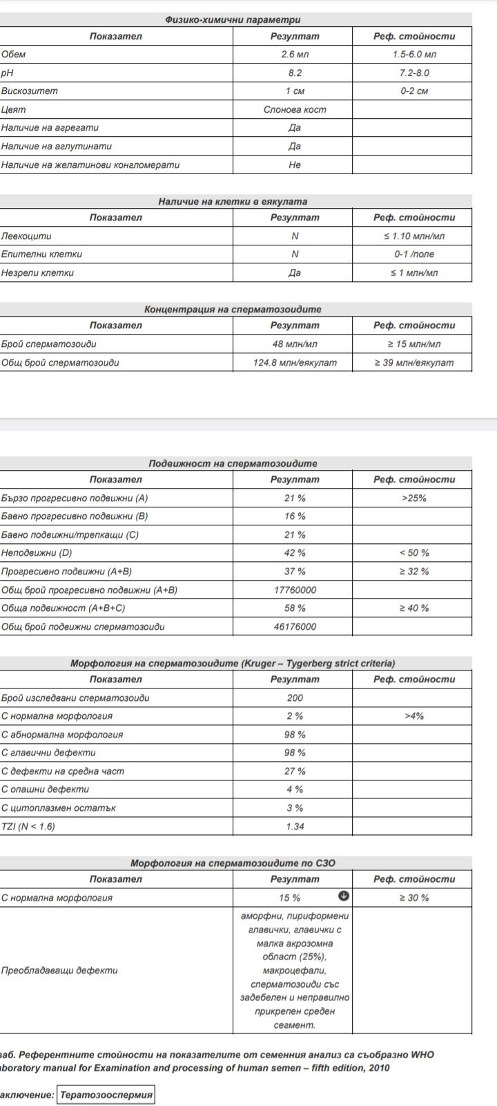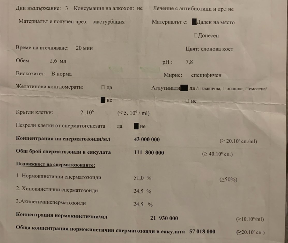 Бях честно казано, изненадана от чутото. Каза, че спермограмата не изглеждала добре и, че евентуално с прием на витамини биха се подобрили показателите.