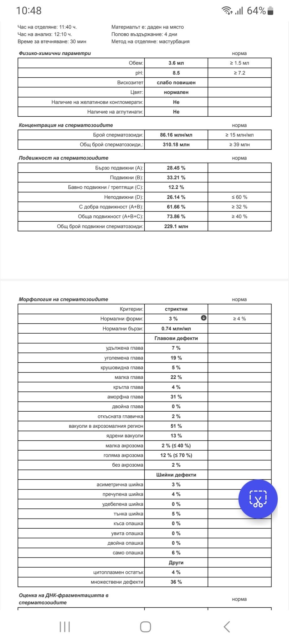 Mikmarr, не са чак так толкова лоши резултатите. Броя компенсира. 2% от висок брой е добре. Може да се опита да повлияе с добавки и промяна в начин на живот, елиминиране на алкохол, цигари и тн, повече спорт и добра диета. Дори и морфологията по-трудно да се повлиява може още да подобри броя и скоростта. При нас всяко дребно нещо, вярвам, помогна. За справка ММ с олигоастенотератозооспермия, аз с поликистоза и хашимото.