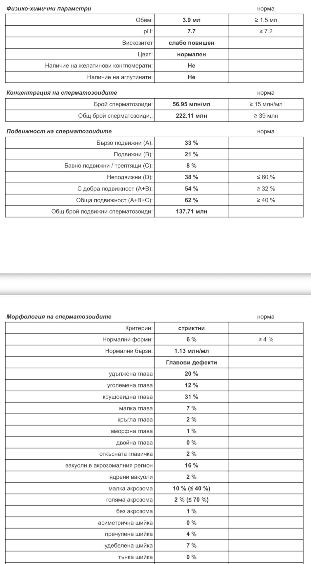 Окей, аз питам за излезлите резултати без морфологията , тя е до 3 дни . За ниските нива , които са посочени на общия брой сперматозоиди. Нищо не разбирам , знам , че тук дамите сте запознати със сигурност повече от мен , за това попитах тези стойности лоши ли са добри ли са