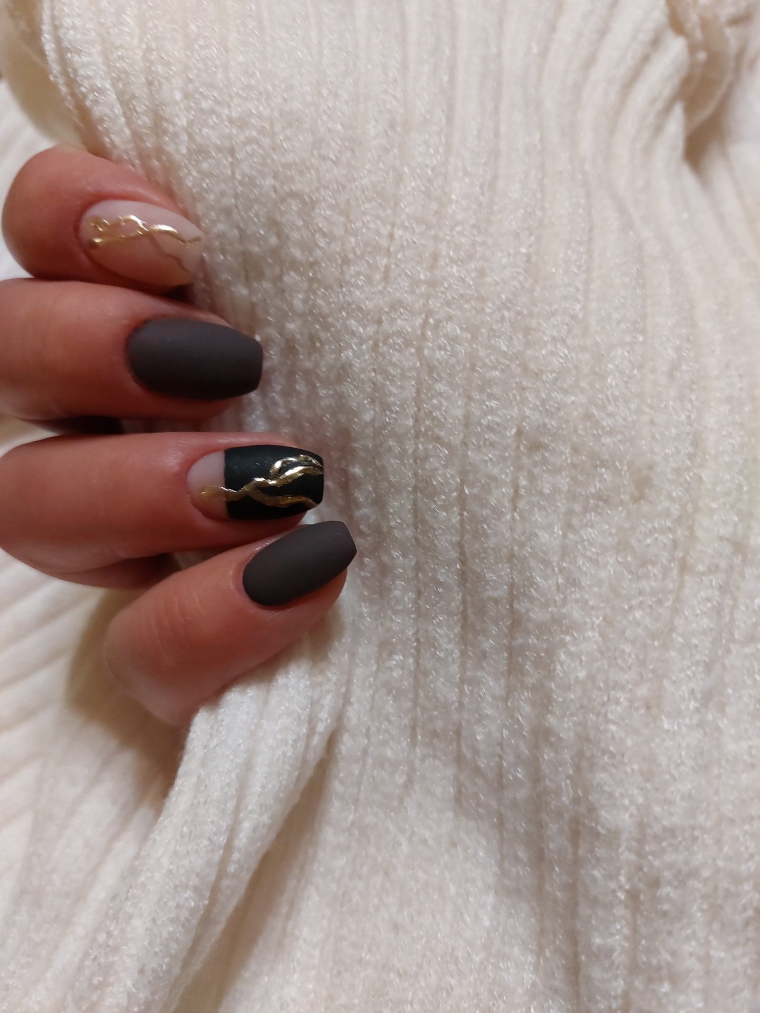 Това направих днес. Реално хич не ми допада крайно, но ще то нося, че нямам нерви да махам. Inspiration-a реално беше с едно по-светло кафяво, а аз имах срамен за моето да е близко до другото, но не оказа се тъмно. И ми идва тъмно много, тъй като в последно време или съм с разни по-бледи или разни летни и ярки цветове. Линиите нещо ми станаха дебели, исках по-тънко да бъде, но предобрих вещо манджата. Поне златното върви  на циганията ми, която направих. Следващото ще е сигурно за празниците чак. И пак съм матова-определето гози топ ми снана любим за ползване. Имам и един друг на lunail, който също е матов до край, но някак другият много лесно се наранява и като закача става на черти, а този е твърд. И пак ще похваля скъпите Wilson накрайници с тях съвсем лесно ми стана да махам покритие. Просто да топ, ако ви се дават 10 евро за 1 накрайник. И последно да си кажа - последните пъти ползвам бонда на Коди и от него съм най-доволна до сега и като спойка, като начин на нанасяне и четка. От много време му се канех и лятото го поръчах от нейлмастера. Преди това съм ползвала клареса и палу, които кано бюджетен вариант са супер, но Кодито е класа над тях.