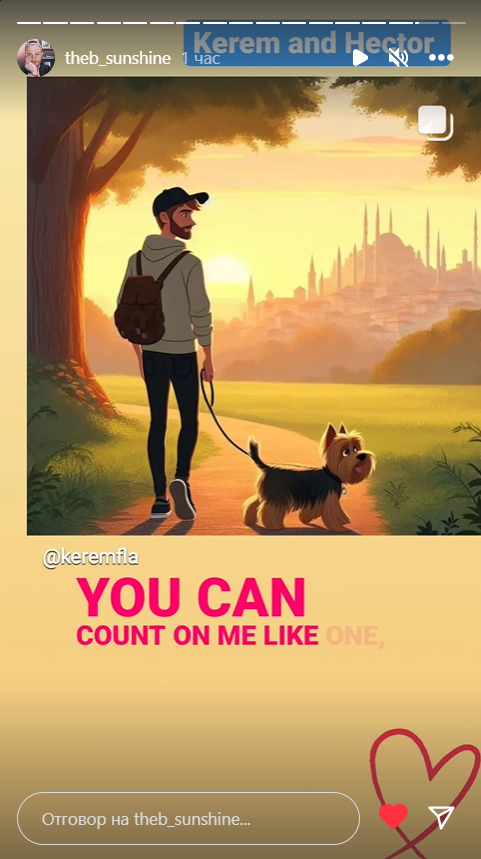 Джу, Керем не е в Испания. По-рано през деня Слънцето качи сторита на испанския му приятел и колега от Оливърс. Екипът е в Истанбул, за да подготвят нещо по Оливърс. Скоро ще стане ясно какво точно, но това е платена платформа, така че ние няма да имаме достъп до съдържанието там.