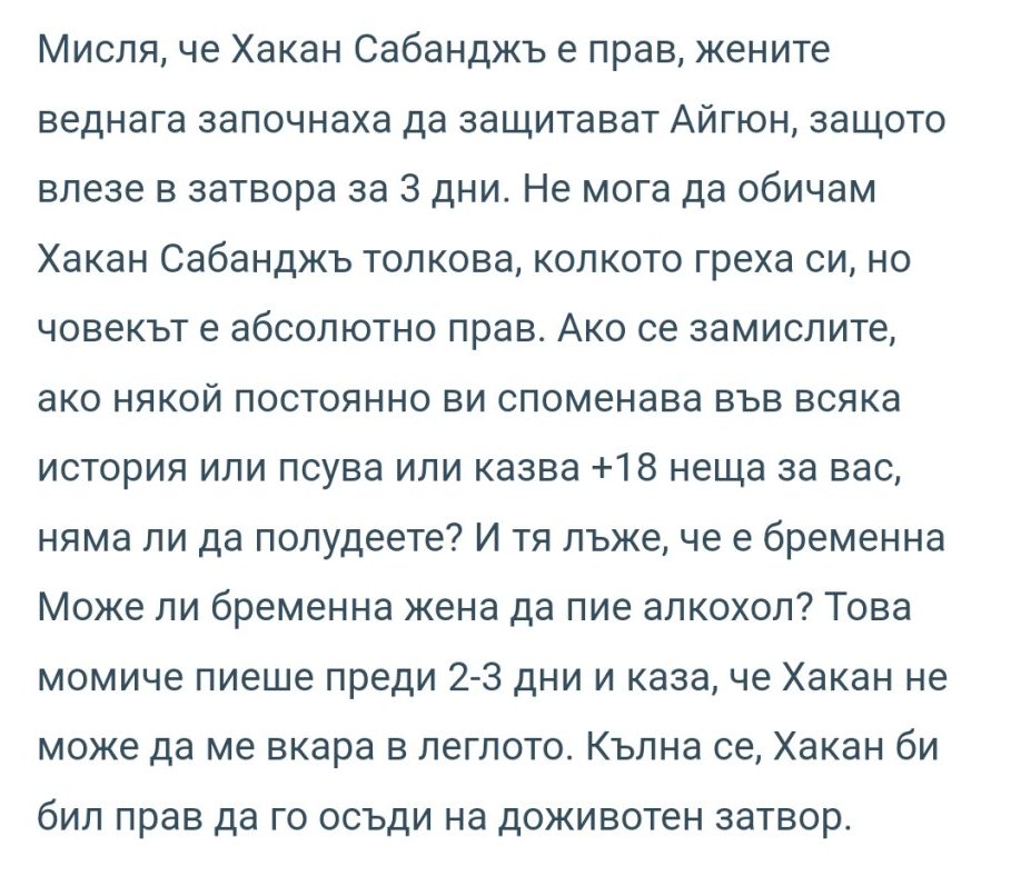 Въпросната жена е лежала няколко пъти за по няколко дни в затвора, заради клеветите си по адрес на Хакан. Април 2021г се разделят, тя пише пост, в който му благодари, че е увеличил последователите й и доходите й. Joy Май месец публикува снимка на видеозон , твърдейки, че това е бременност на 3 месеца, а октомври същата година публикува снимка на бебе, което твърди, че било негово, но е видимо на поне 4-5 месеца. Joy Към момента дете няма и поддържа нова версия, че е направила аборт. Joy Реве по медиите, че нямала пари за адвокат по делата с Хакан, щяло да се наложи да работи като ескорт. Joy Гледах едно нейно клипче в ютуб - пълно куку е за мен...