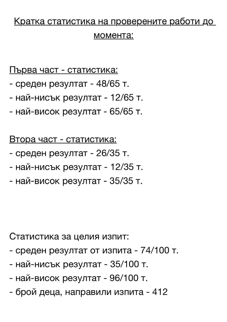 Статистиката със сигурност не е пълна на междучасие. На моя син не са излезли резултатите. Той днес е на школа, може и на място да му го дадат. Ще пиша пак довечера.