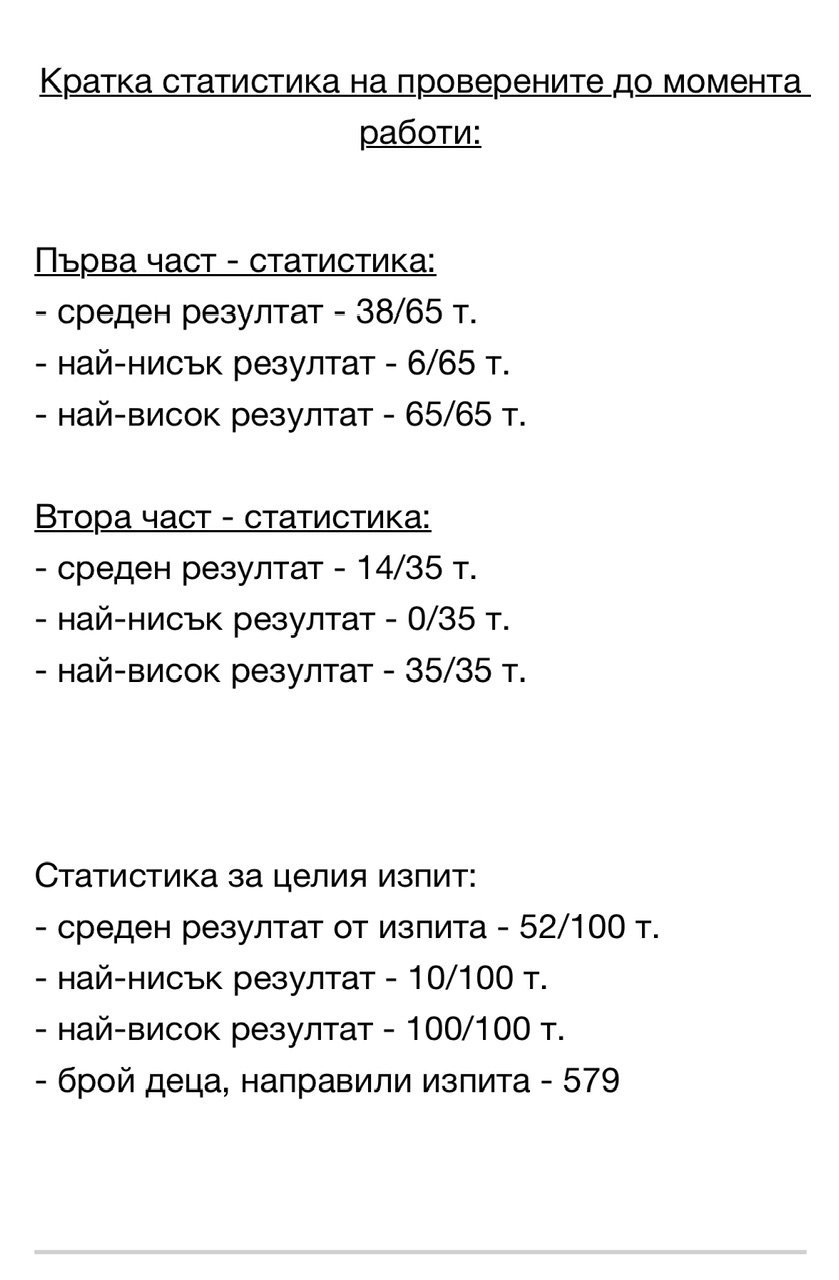 И получената от мен статистика от Междучасие по математика е почти същата като на second. При мен имейлът е от 21ви. По БЕЛ още нищо не съм получила като официални резултати от пробния. Добре, че му върнаха работата на самия курс  Аз, както казах, ще го запиша моя син и на пробните в Регалия в началото на февруари, защото ни е близо, а и той се "продаде" за една почерпка със суфле Laughing Така, че прави пробния, почерпвам го и отива на Физика в неделя.