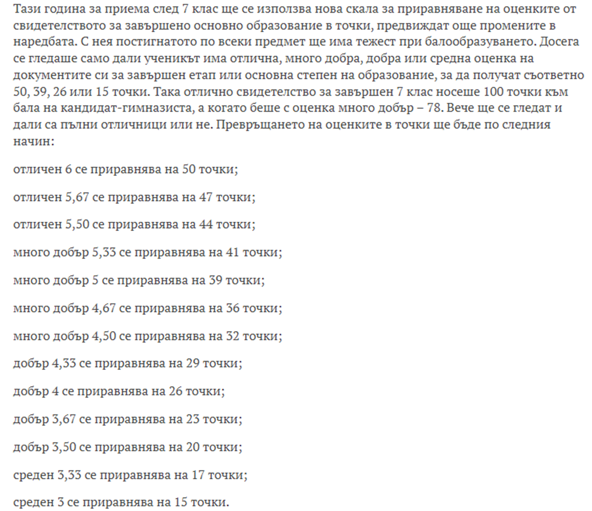 Балообразуващите оценки от свидетелството се преобразуват в точки както следва: