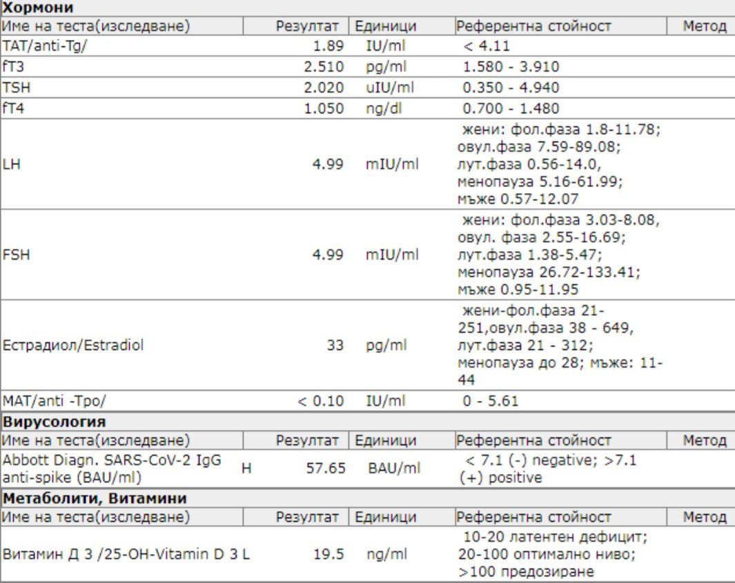Имаш сериозен дефицит на вит. Д... виждам че антителата за К19 са високи. Ако скоро си боледувала, това може да е причина или една от причините за по-ниските нива на вит. Д. Провери желязото ( т.н. Железен панел ), цинк, мед и селен... Прогестерон ( +Е2) - точно на 7-ми ден след доказана О.