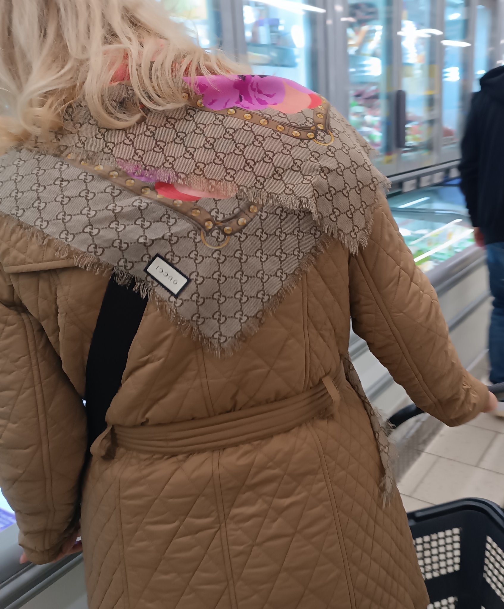 Не забелязвате ли, че шалчето е изкривено за да се види етикетчето?! Смешна и жалка е госпожата, затова я изтипосах тук
