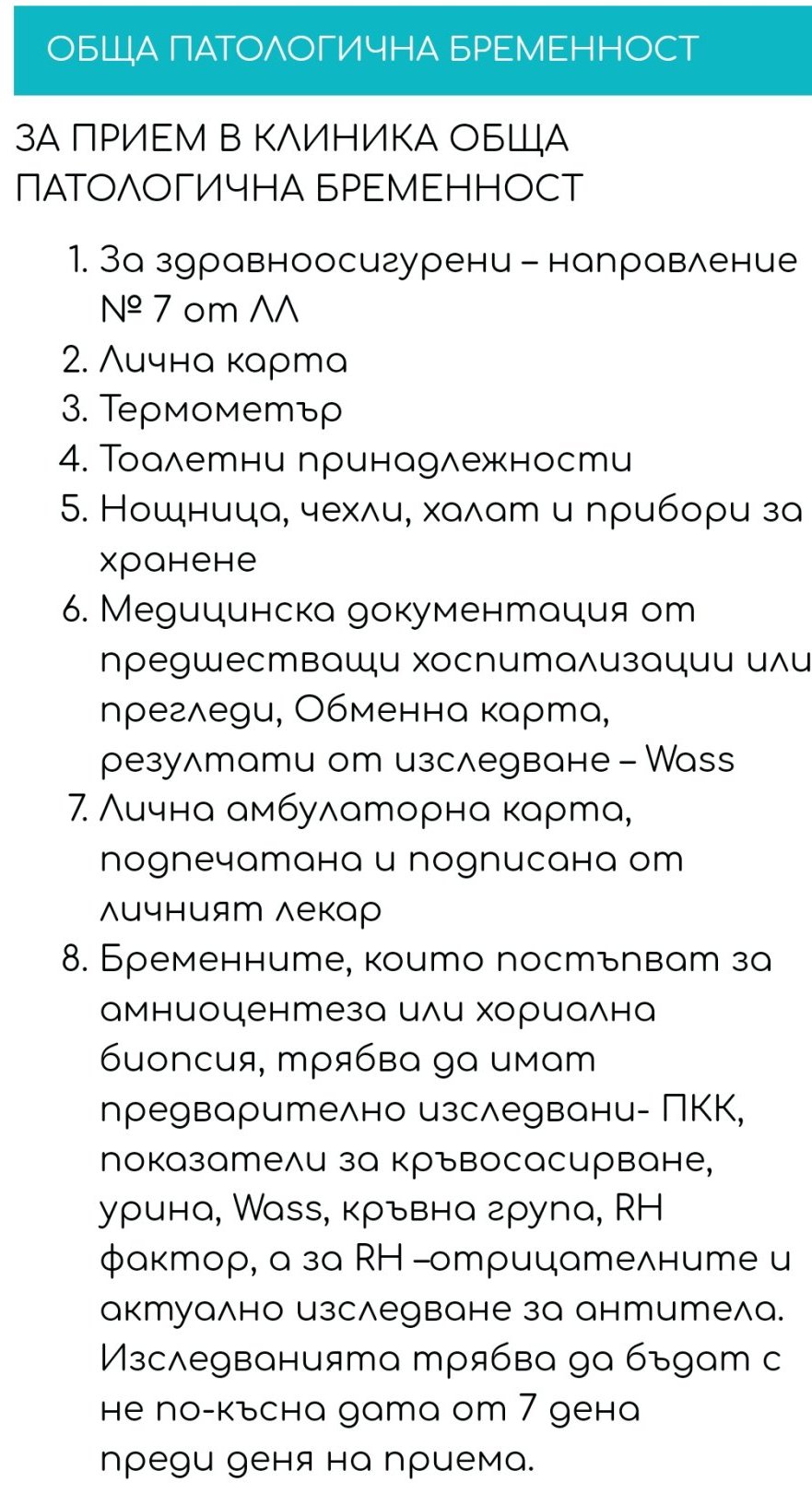 Аз бях в твоята ситуация. Ще те настанят на 5ет. , който по принцип се води патология. Ремонтирано е, стаите са чистички, редовно почистват и сменяват спалното бельо. Аз успях дори да изградя приятелства за периода , в който бях там. Разбирах се и с персонала. А пък доктор Гърчев, който отговаря за този етаж, е страхотен и супер забавен. На етажа има 2 бани и тоалетни в приемливо състояние за държавна болница. Има хубава тераса, на която можеш да си седиш на слънчице. Също така има общ хладилник, който можеш да използваш. Наблизо има супер маркет и плод и зеленчук. Аз редовно се разхождах. Можеш да излизаш след като сутрин е минала визитацията, ако искаш можеш да си ходиш и в някой мол хаха но до 20ч трябва да си се върнала, защото заключват. Има кафене на партера ,продават закуски и правят сандвичи. Има и стол ,точно след кафенцето, готвят много вкусно и менюто е разнообразно, има различни салати,супи и основно. Лекарите и медицинският персонал също се хранят там. Ако с нещо друго мога да ти бъда полезна ,пиши ми. Леко раждане ❤️