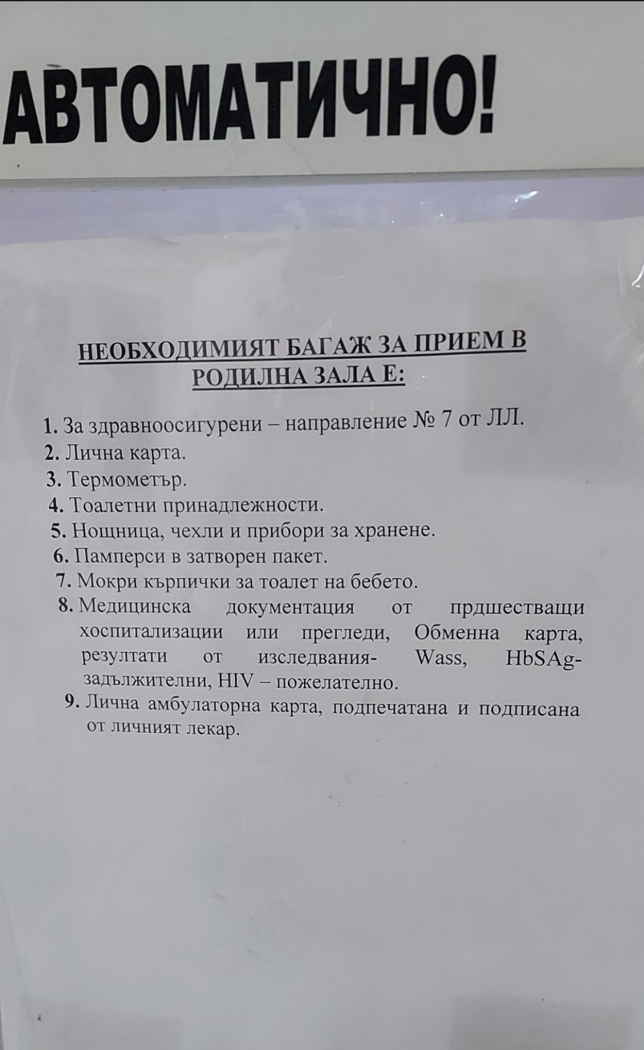Здравей, мога да помогна само със списъка за родилното, тъй като и на мен ми предстои раждане и съм се насочила към МД. Снимката е от преди две седмици. Като мен ме прати до спешното следящия ме АГ да си взема нужните декларации за прием за да си ги прочета и попълня вкъщи на спокойствие без да пиша дата и само да ги взема с мен като тръгна да раждам.