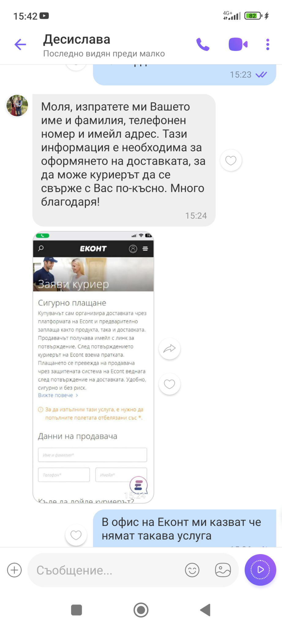 Проблемът е , че тя не предлага класическата форма на наложен платеж, а да "уреди" доставката, като напишете в Гугъл "измама Еконт" ще видите същия чат, същите изречения и екранна снимка на услуга уж от сайта на еконт, а аз не мога да я открия тази услуга в сайта на Еконт.