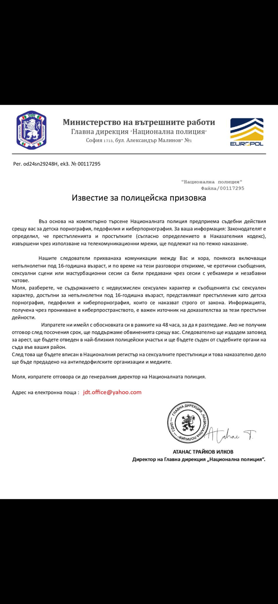 Препрати го към МВР. Изготвянето на документи с невярно съдържание, каквото е това писмо, вкл. и използването на чужд подпис е сериозно престъпление.
