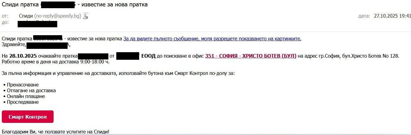 Отвори сайта на Спийди и проследи товарителницата чрез ръчно въвеждане - без да кликваш на линкове. Така трябва да стане ясно има ли пратка или е фейк.