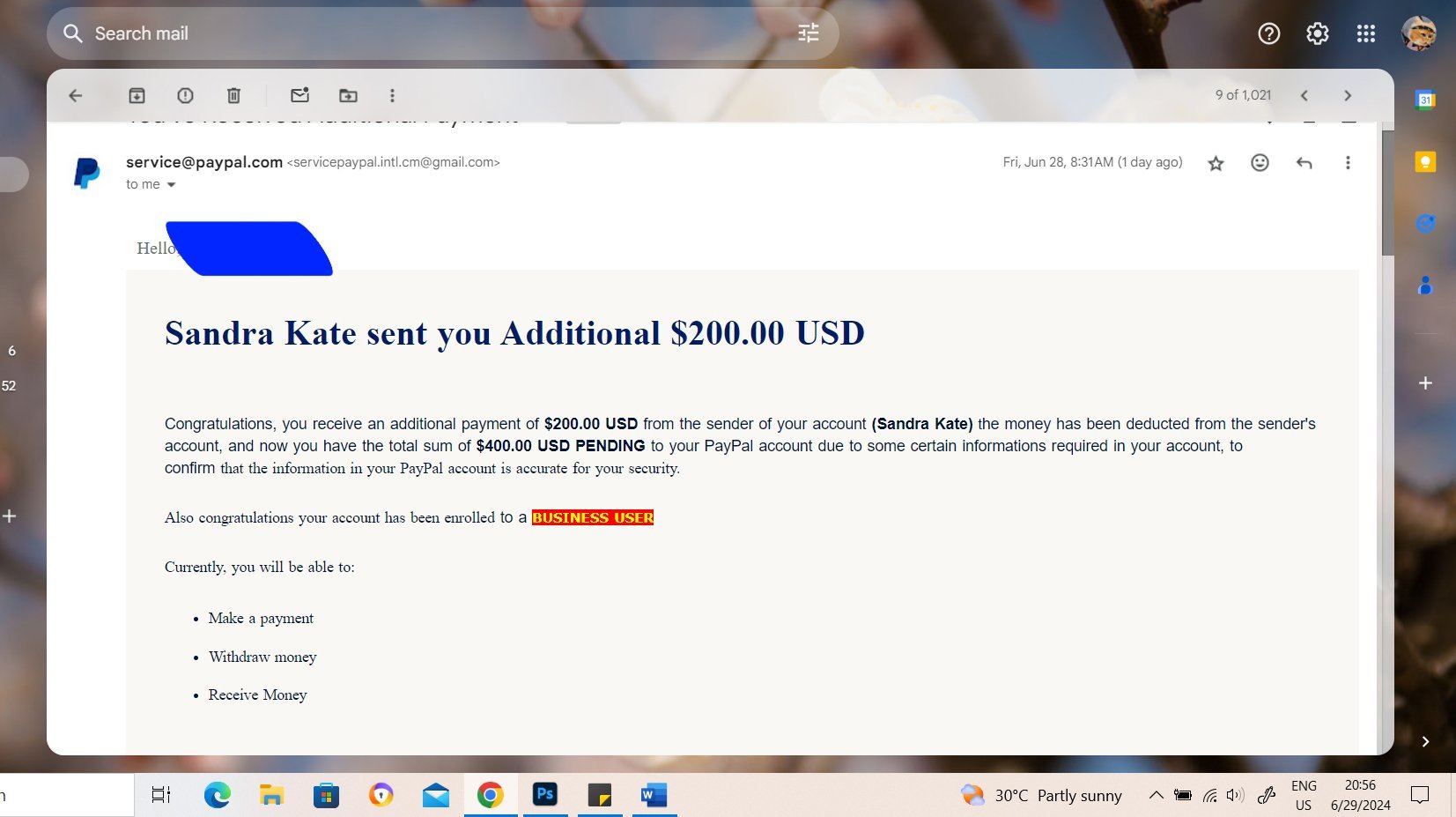 Преведе ми уж парите, получих потвърдителен мейл от пейпал, но не и сумата в акаунта, защото: се оказаха, повече от колкото моят акаунт приемал и трябва да стане тип бизнес акаунт. И затова трябвало да ми се преведат още 200 USD , които после трябва да върна обратно на този който ми ги е превел ( в случая тази пачавра) за да може тази сума от 400 USD да се отключи и падне в PayPal акаунта ми ...