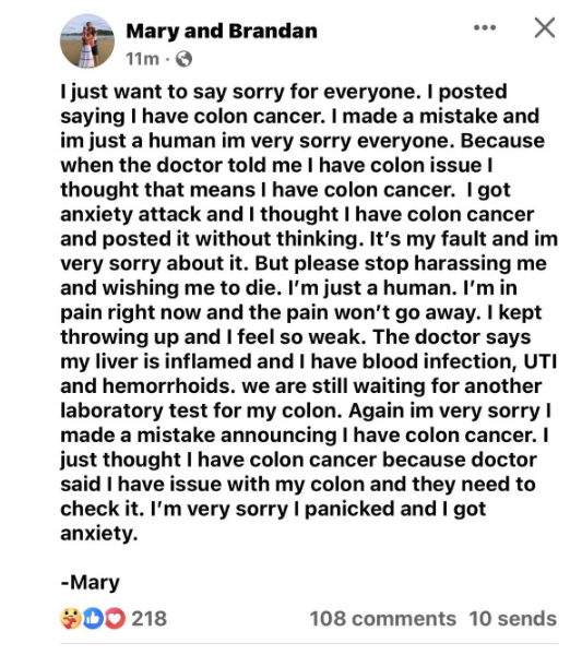 Мери се извинява, че е излъгала за рака - според нея не е лъжа, а понеже страда от тревожност, е прибързала и когато докторът казал, че има стомашни проблеми, тя е разбрала, че има рак: