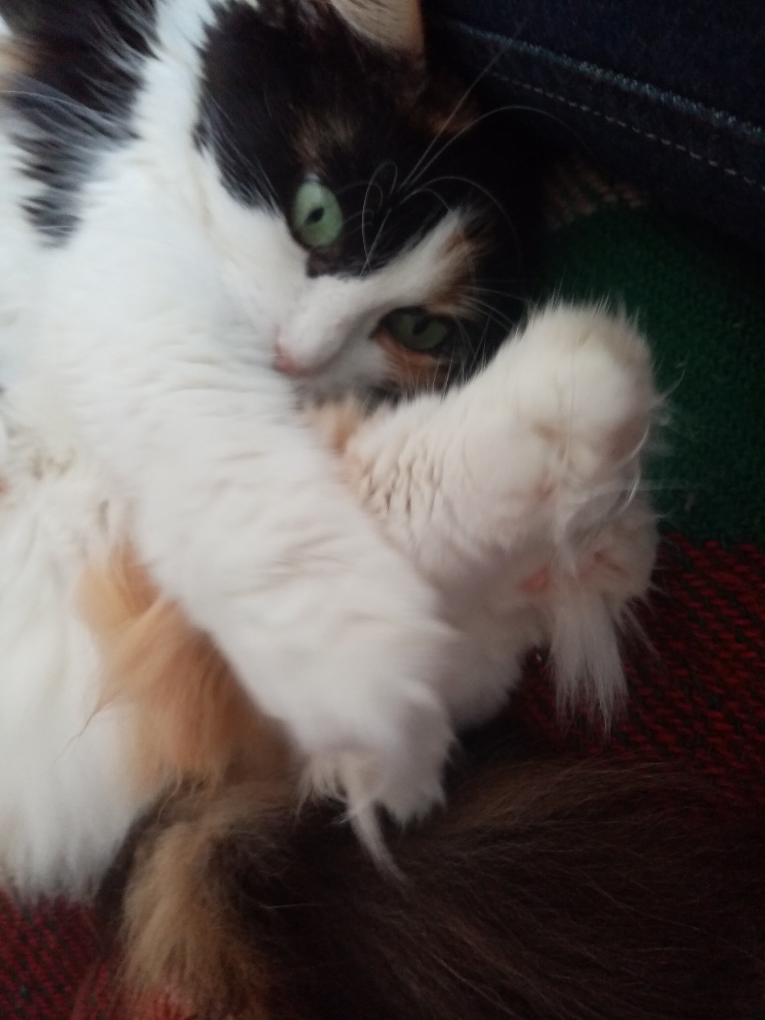 Притеснявам се за него, защото макар да не ръмжи, забелязвам, че не е така спокоен, по-малко мърка. Даже почти никак. Тази сутрин се наложи да го викам няколко пъти преди да направи обичайното си за всяка сутрин скачане в скута ми като се събудя и седна в леглото. Друг път тича и с обилно мъркане и даже леко примяукване скача и се започва едно търкане с главичката, близане на косата ми. А тази сутрин едва го накарах да скочи в мен. Погалих го както всяка сутрин, за да му създам усещането, че нищо не се е променило, но имам чувството, че макар да не личи много, вътрешно е стреснат. Тя просто постоянно му ръмжи.