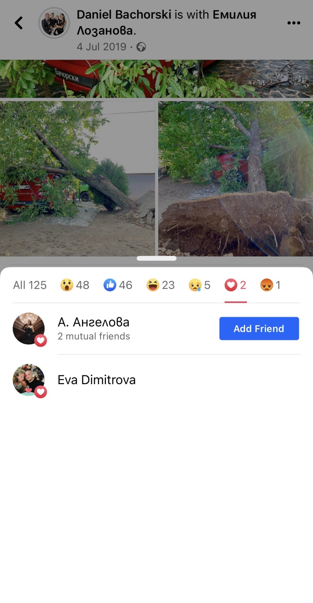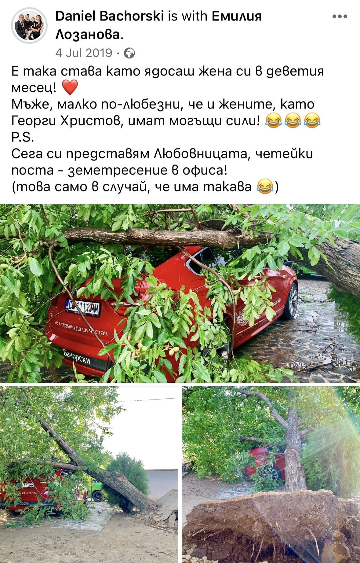 Аз лично така го разбирам - Емилия сподели, че още в осмия месец от бременността е разбрала за отношенията на Бачорски с Атанаска. Явно е имало някакъв конфликт юли месец, както и обвинения към него, че има любовница и доколкото виждам от снимката дърво му е паднало върху колата 😀😀😀. Той в поста обвързва нещата по този начин, че сякаш случилото се на колата е в резултат от това, че Емилия му е била ядосана заради нещо - като карма. И типично в негов “естествен и истински” стил помества накрая частта с “Л”юбовницата като насмешка с оглед ситуацията, но към днешна дата знаем всички как са се развили всъщност нещата… А Насето, знаейки че точно нея визира (шеговито или не толкова), праснала едно сърце да се набие на очите на Емилия, предполагам.