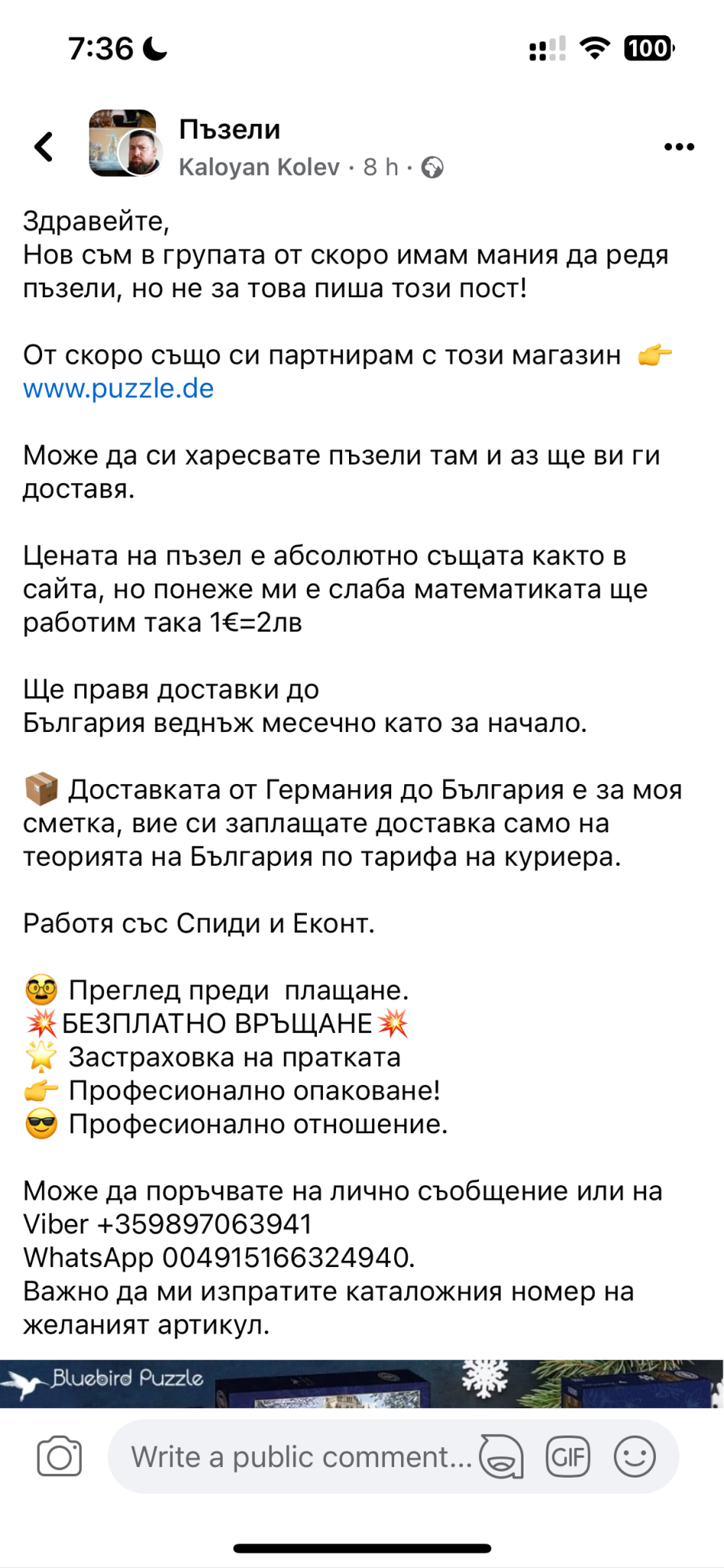 А за доставката, не е ли възможно този човек да получава голям процент комисионна ако поръчва 100 пъзела на куп да речем и да има редовен транспорт на други неща и покрай тях пъзелите. Предлага преглед и безплатно връщане.
