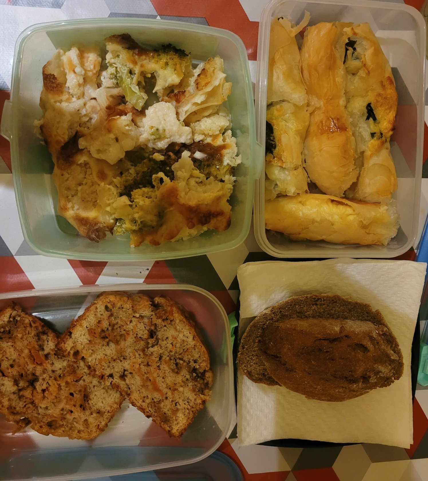 За днес запеканка с броколи и карфиол,баница със спанак,морковен кекс и пълнозърнест хляб