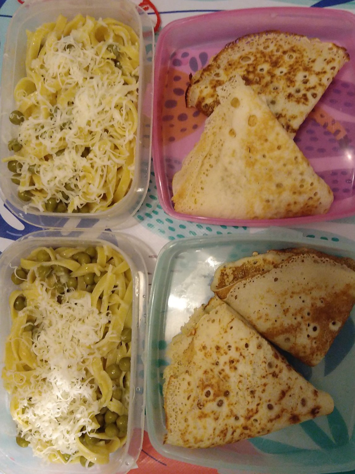 Палачинки с мед за закуска, паста с грах и настърган кашкавал за обяд.