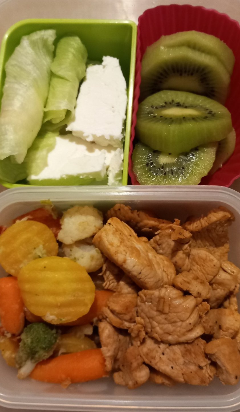 Обяда е от задушено пуешко със зеленчуци,  сирене, маруля с крем сирене и киви.