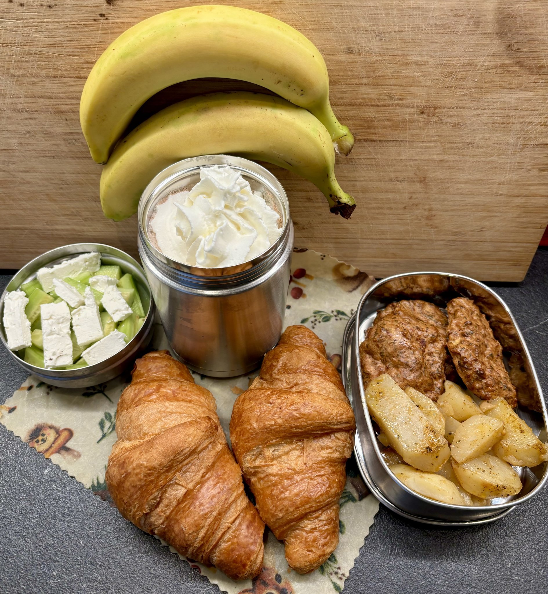 Мляко с какао и сметана отгоре, кроасани, мини шницели с картофи на фурна, краставица, банани