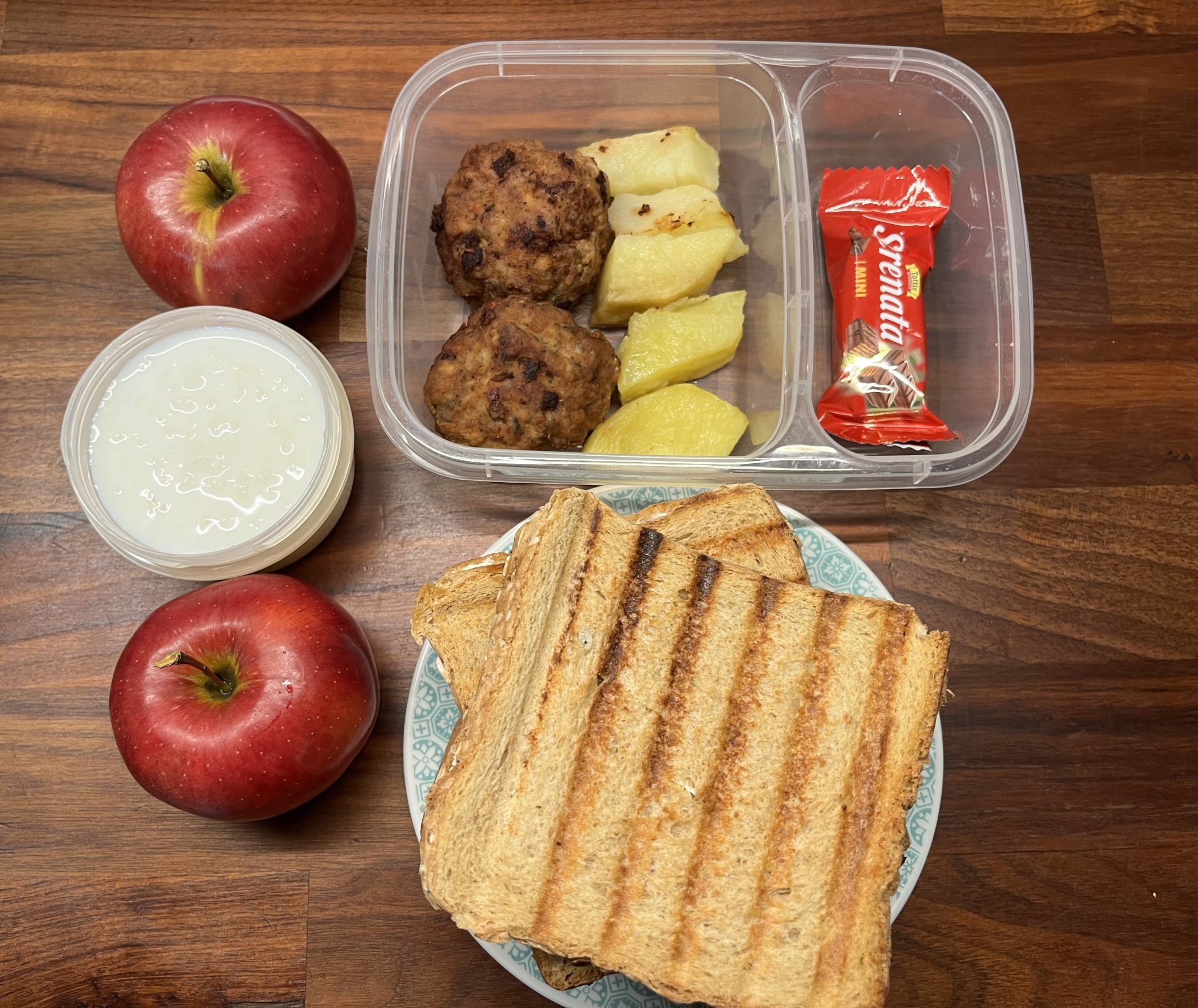 За утре-за закуска-топъл сандвич с кашкавал,за училище-кроасан с масло и суха паста.