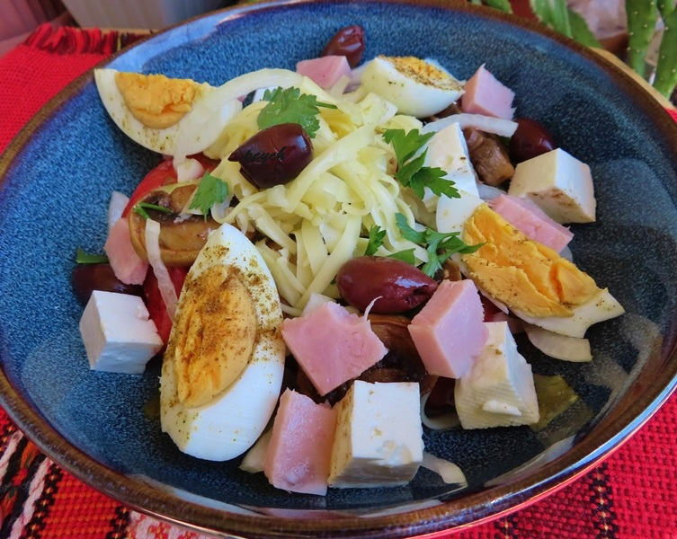 От тук бих тръгнала аз. За узото и ракията най-върви свежа салата, но доматите са кофти в този сезон. Затова чери домати, червен лук, краставици, маслинки от гръцките, и накъсана маруля за основа. Зехтин и лимон за дресинг. Пикантно бяло сирене, оваляно в подправки за гарнитура на салатата, да е нещо по-различно все пак, а не просто балканската салата, която си я знаем. Няма да има недоволни, още повече след всичките тежки храни, които изядохме за Коледа.