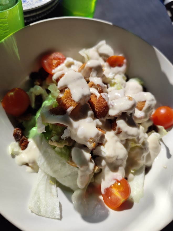 Вариация на Цезар с добавка от карамелизирани орехи и печено козе сирене. Уау! Не съм любител на козето сирене, но вкусовете тук бяха страхотно балансирани. Жалко, че салатата беше на ММ Simple Smile