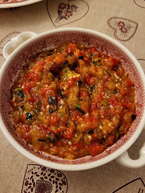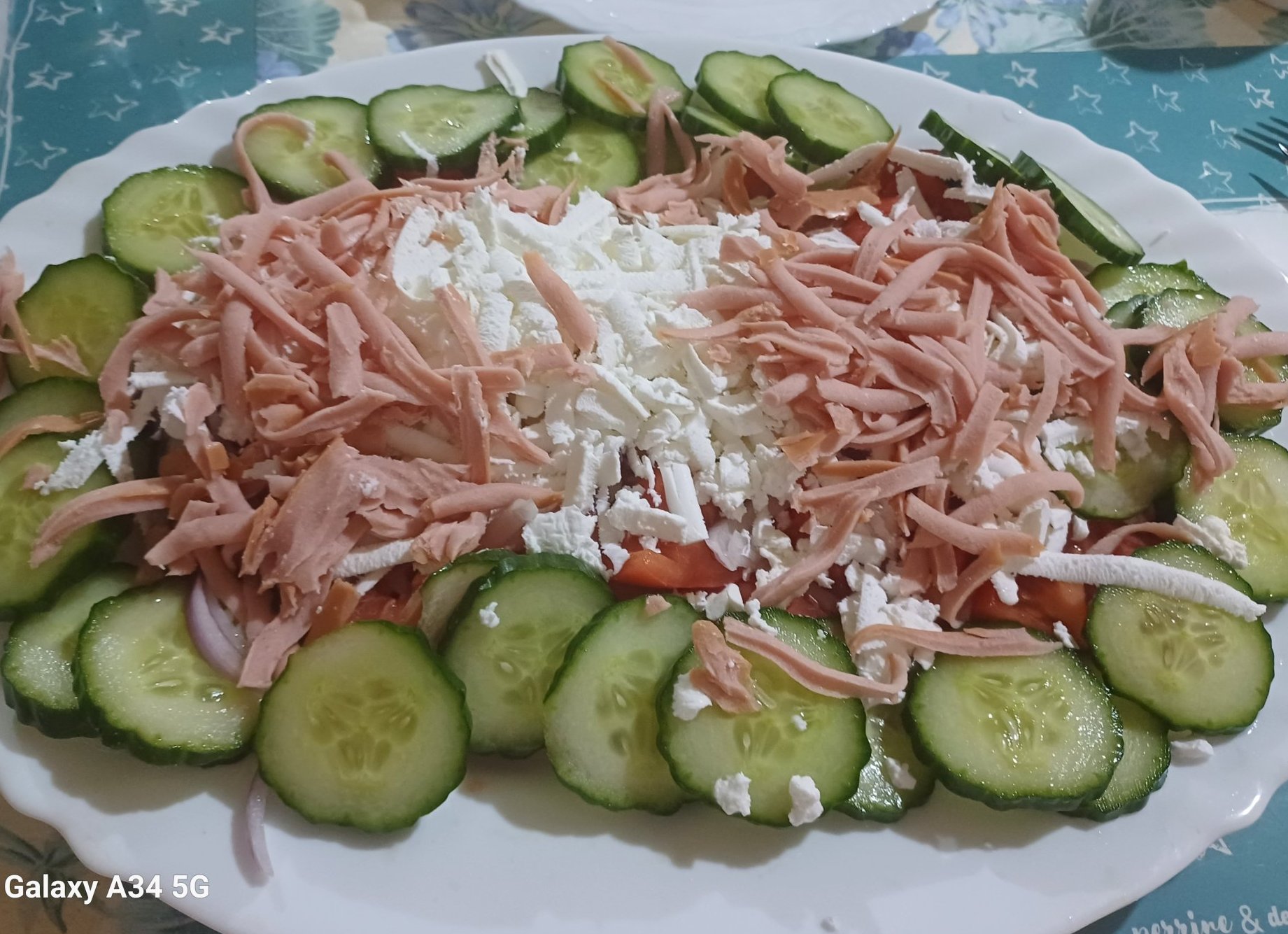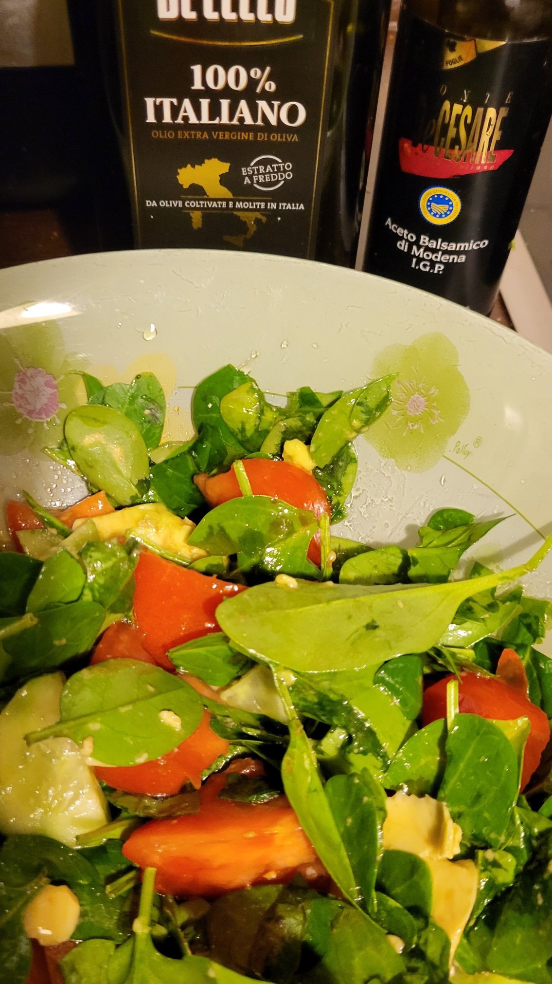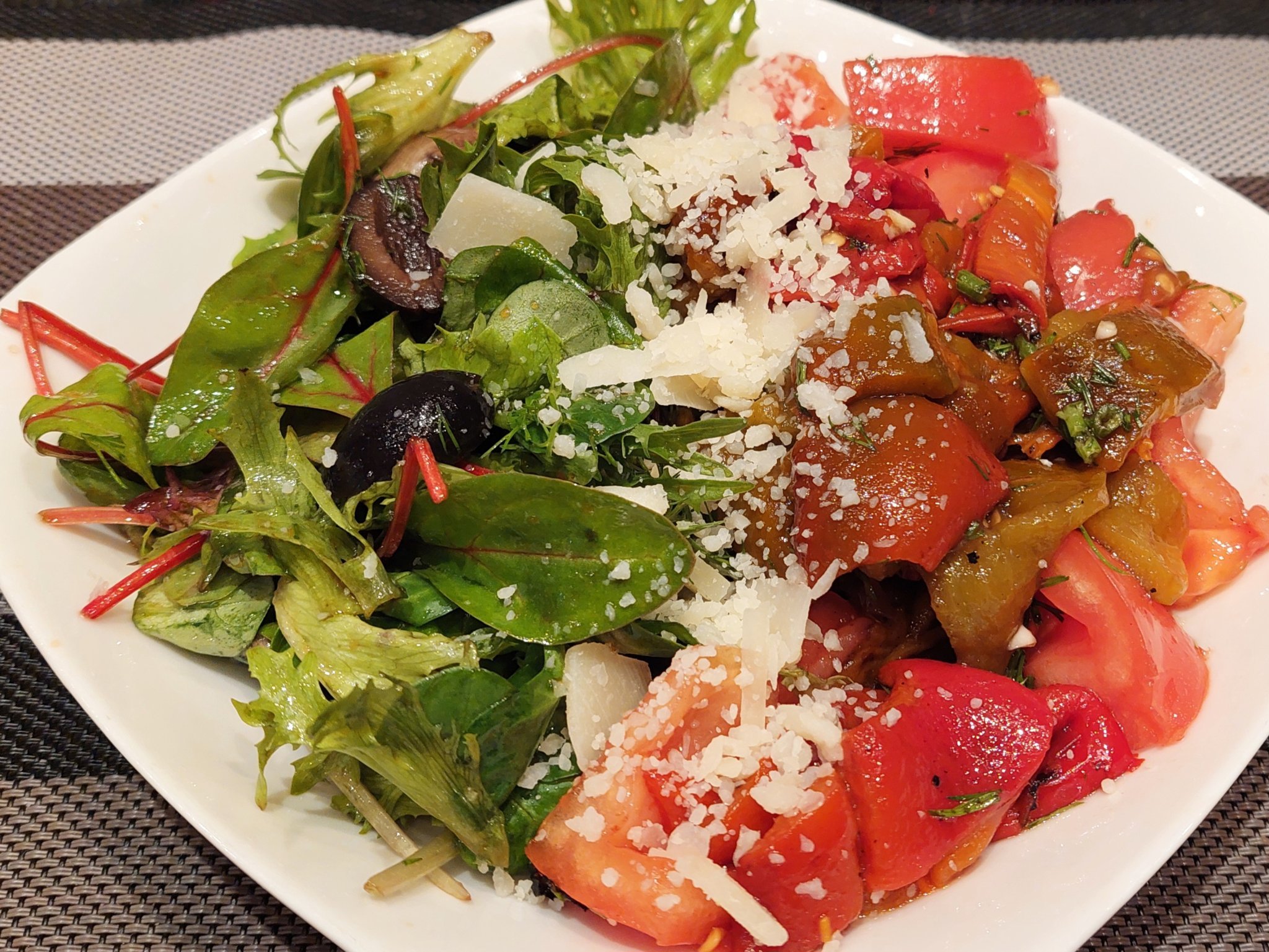 Домати с печен пипер и копър, зелении микс с маслини и балсамов оцет, и пармезан.