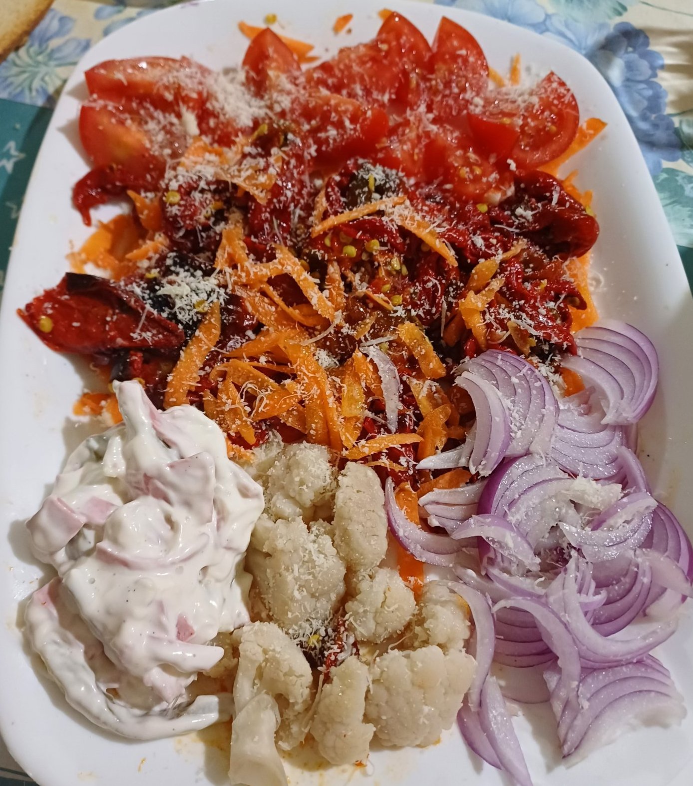 Шарена салатка - печена чушка, чери, карфиол, морков, червен кромид (и малко купешка салата с майонеза), поръсени с пармезан