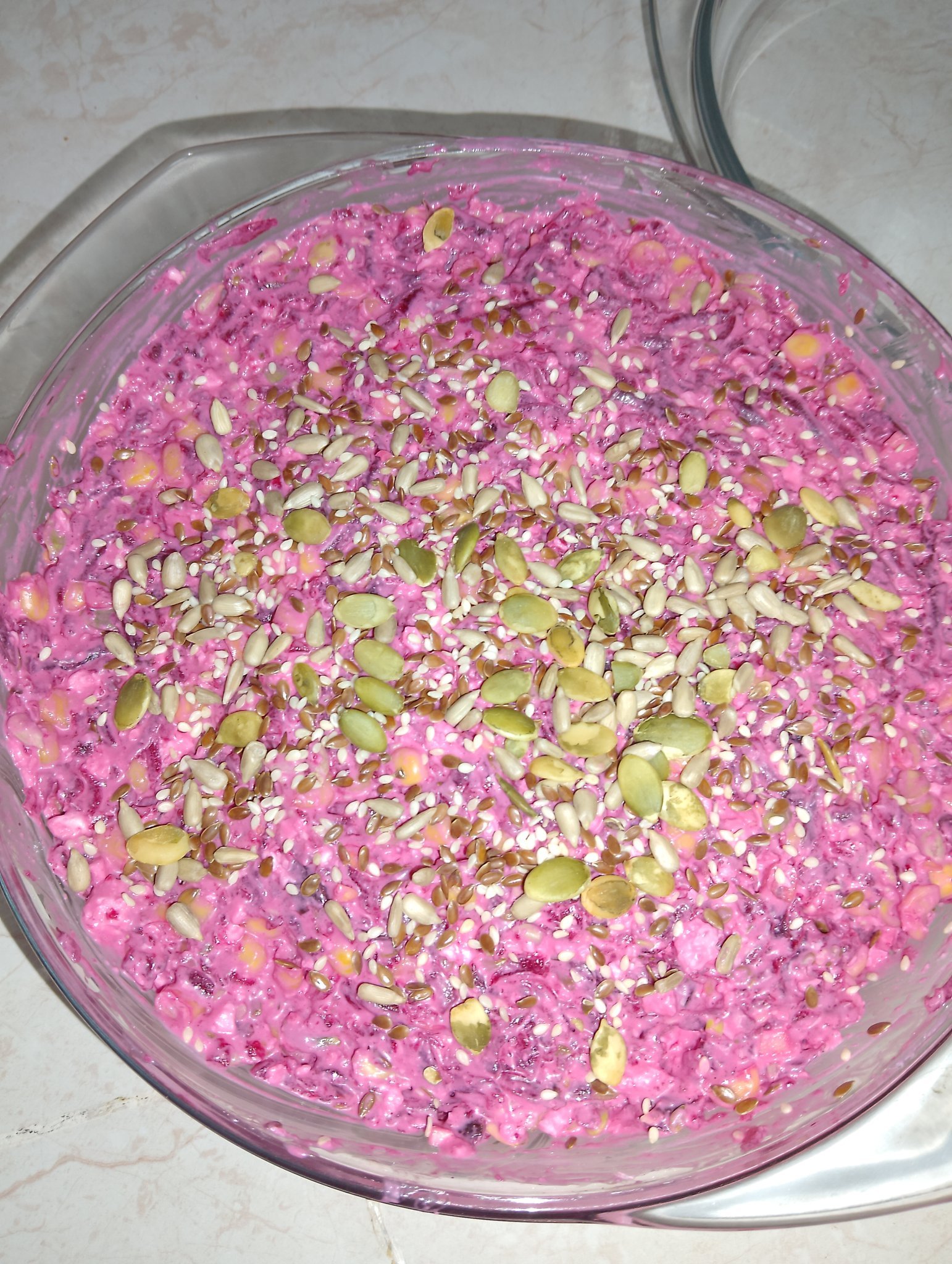 Салатка от варено цвекло с майонеза и чесън. Натроших малко сирене, сложих една изостанала царевица и ръснах малко семена за разкош