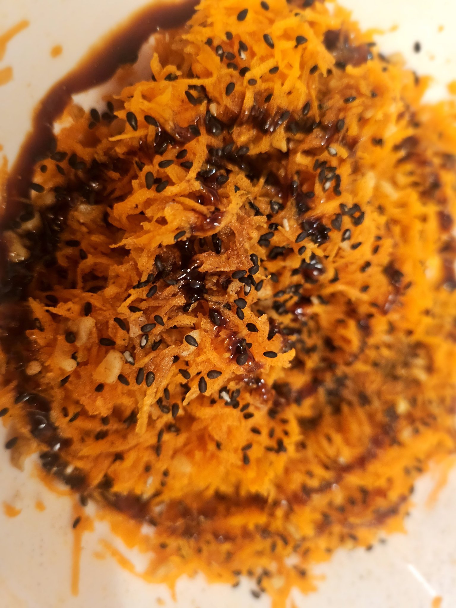 От мен една бърза морковена със орехи, черен сусам и сусамово олио + балсамова редукция.