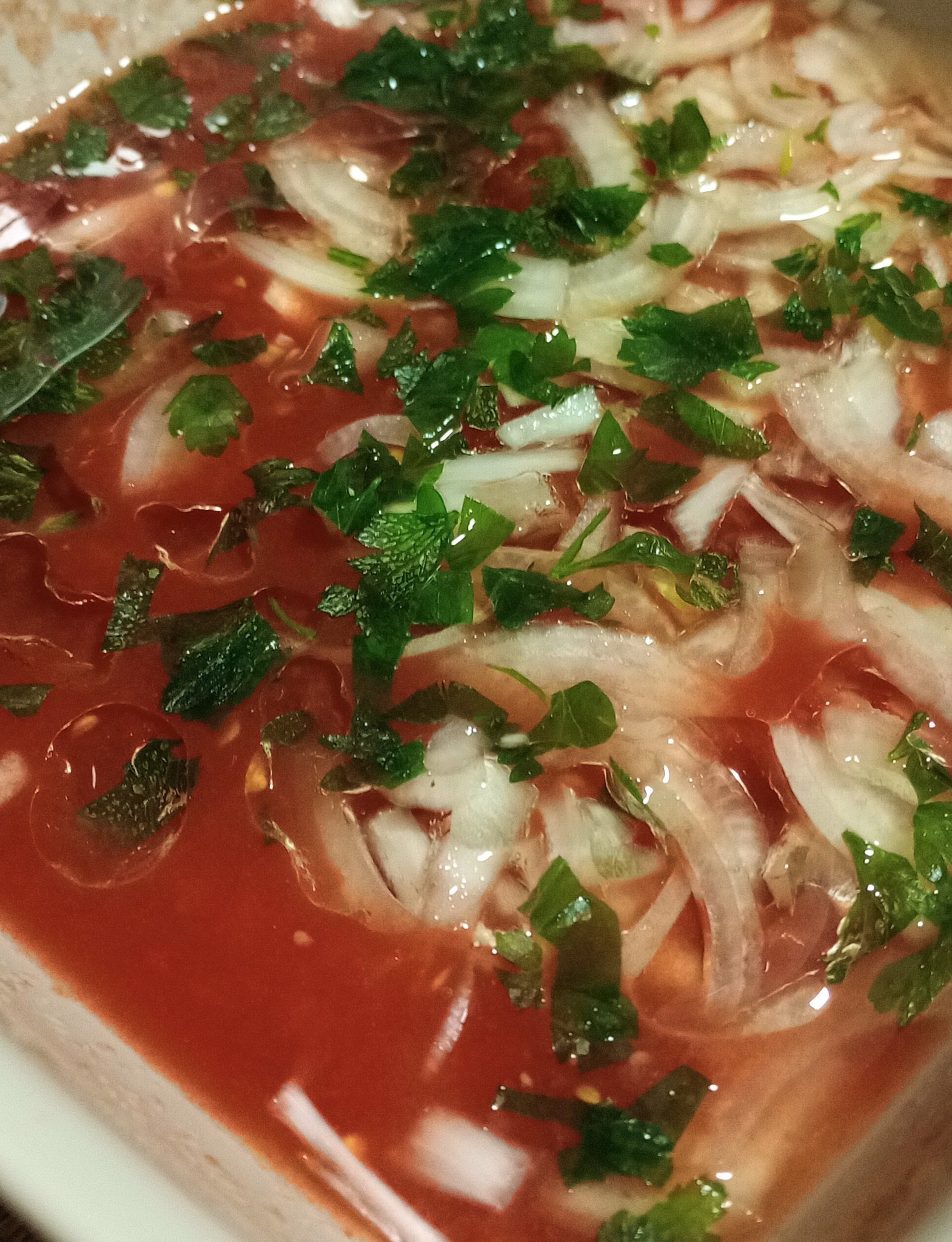 Салата от черен и червен боб, царевица, печени червени чушки, сотиран червен лук, Магданоз, доматено пюре, оцет и зехтин.