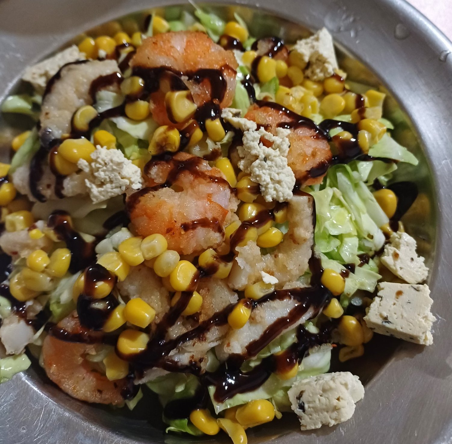 Зеле, царевица, скариди и малко калмари, балсамико и тофу с подпровки