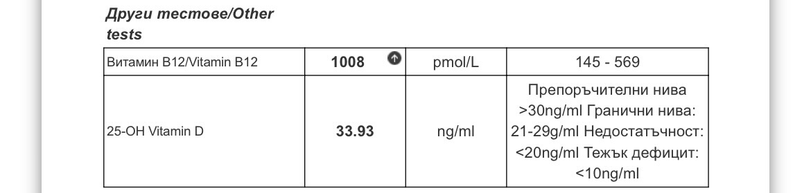 Mibobo, благодаря за отговора. Сигурна съм, че не приемам никаква добавка с вит Б12, проверих вече 3 пъти всичко. Спрях да ям месо и ще пусна пак изследване. Ако няма промяна ще изследвам литий, ще проверя черния дроб, бъбреците, кръвната захар. Това е планът засега.