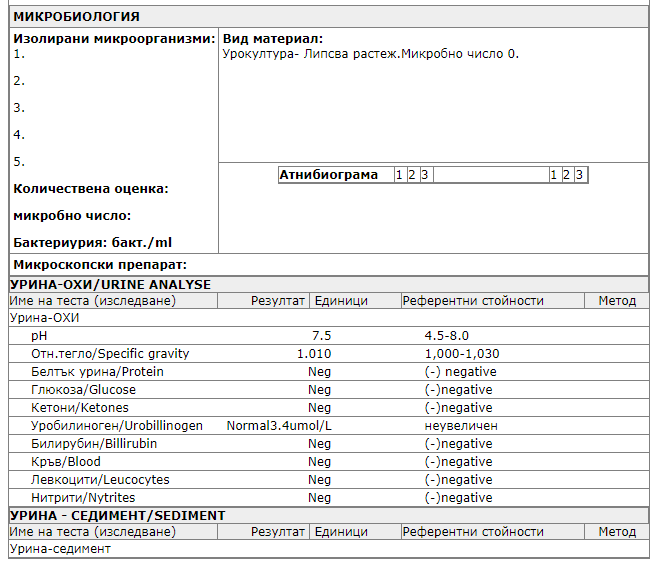 Въпросът ми е защо стерилна урина се изследвала сутрин? Бяха ме пратили с вагинален секрет следобед, но не бях яла последните 8-10 часа и реших, че е същото и мога да използвам да дам и урина, понеже имам симптоми на цистит отвреме-навреме и абсолютно никакви на вагинална инфекция. Това са резултатите: