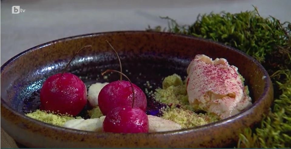 Любимият ми победител от всички сезони дотук е Мария Жекова, и като техника и познания, и като отношение към храната и природата. Странното е, че от нейния сезон май не помня почти никого освен нея, а е излъчен най-скоро, докато от по-ранни сезони помня повече участници. Това е десертът ѝ на финала - мус от диви череши, сладолед с вишновка и махлеб, кръмбъл с маточина и сос от череши: Flowers Cherries