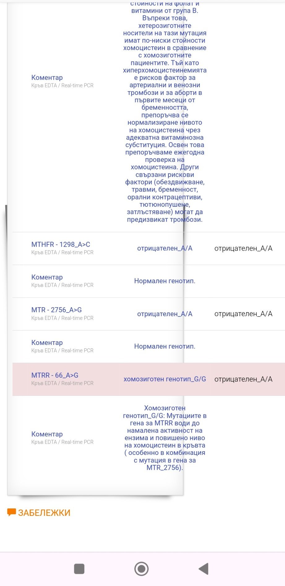 В допълнение имате мутация в MTHFR, свързан с усвояването на витамините от група Б. Премерете нивата на витамините Б9 и Б12 и при ниски стойности приемайте само метилирани форми - неофолик Мета / метил фолат вместо синтетична фолиева киселина за Б9, и метилкобаламин вместо синтетичния цианкобаламин за Б12.