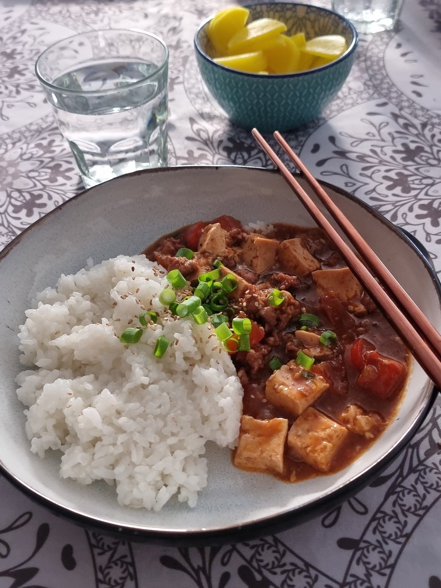 Mapo tofu - корейска яхния с тофу, кайма, малко зеленчуци и лютив сос.