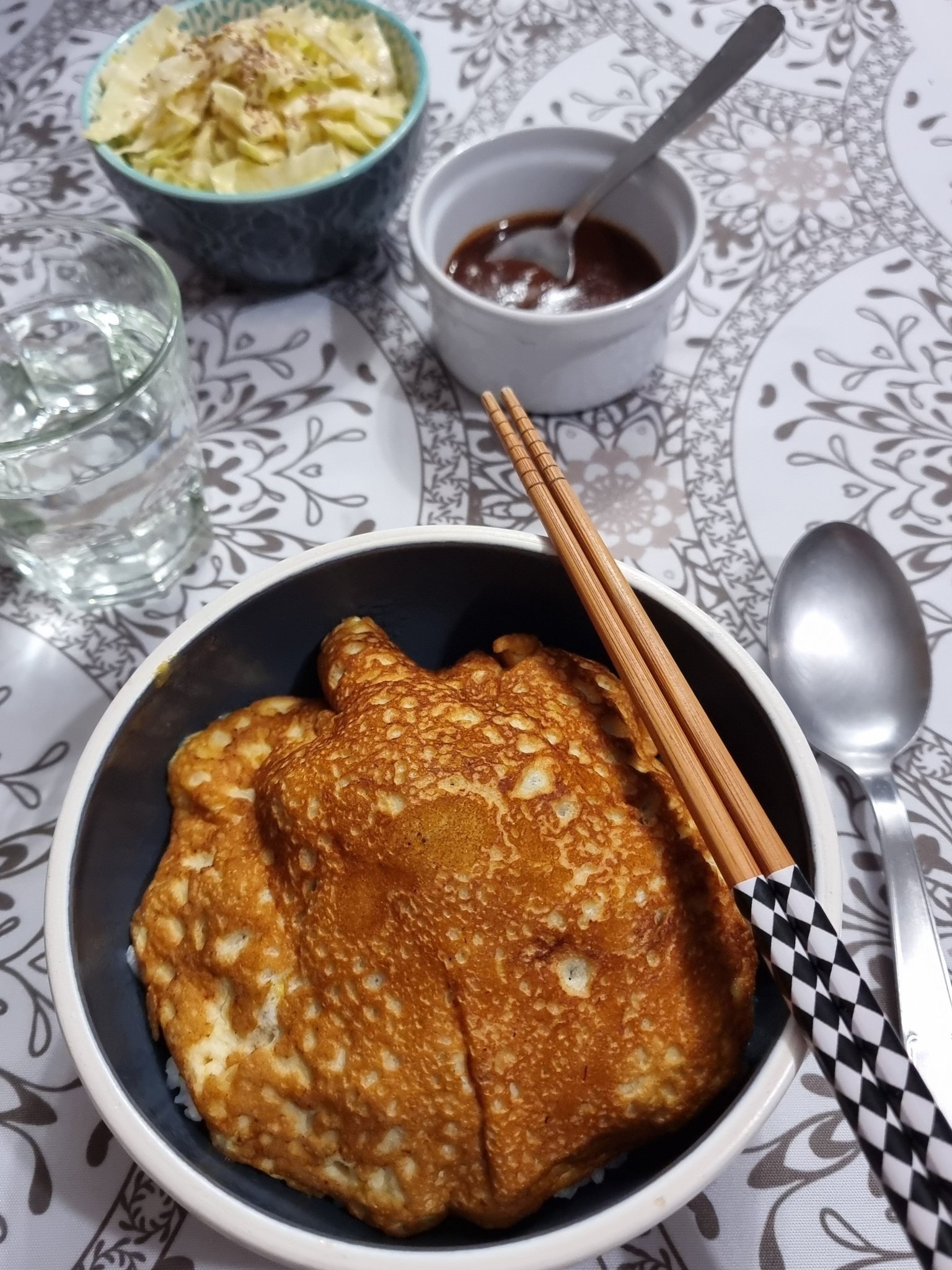Ому-дон - купа с ориз, задушена кайма с лук и зеле, обвита от тънък (малко попрегорял Grinning) омлет и сос с мисо, кетчуп и разни други нещица.