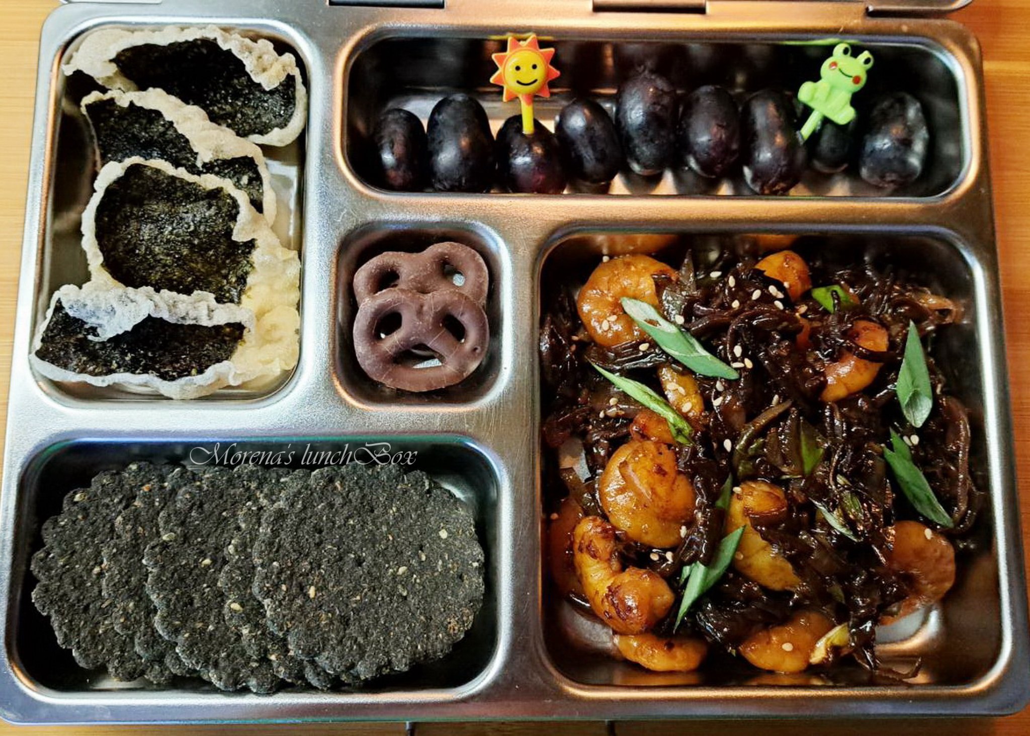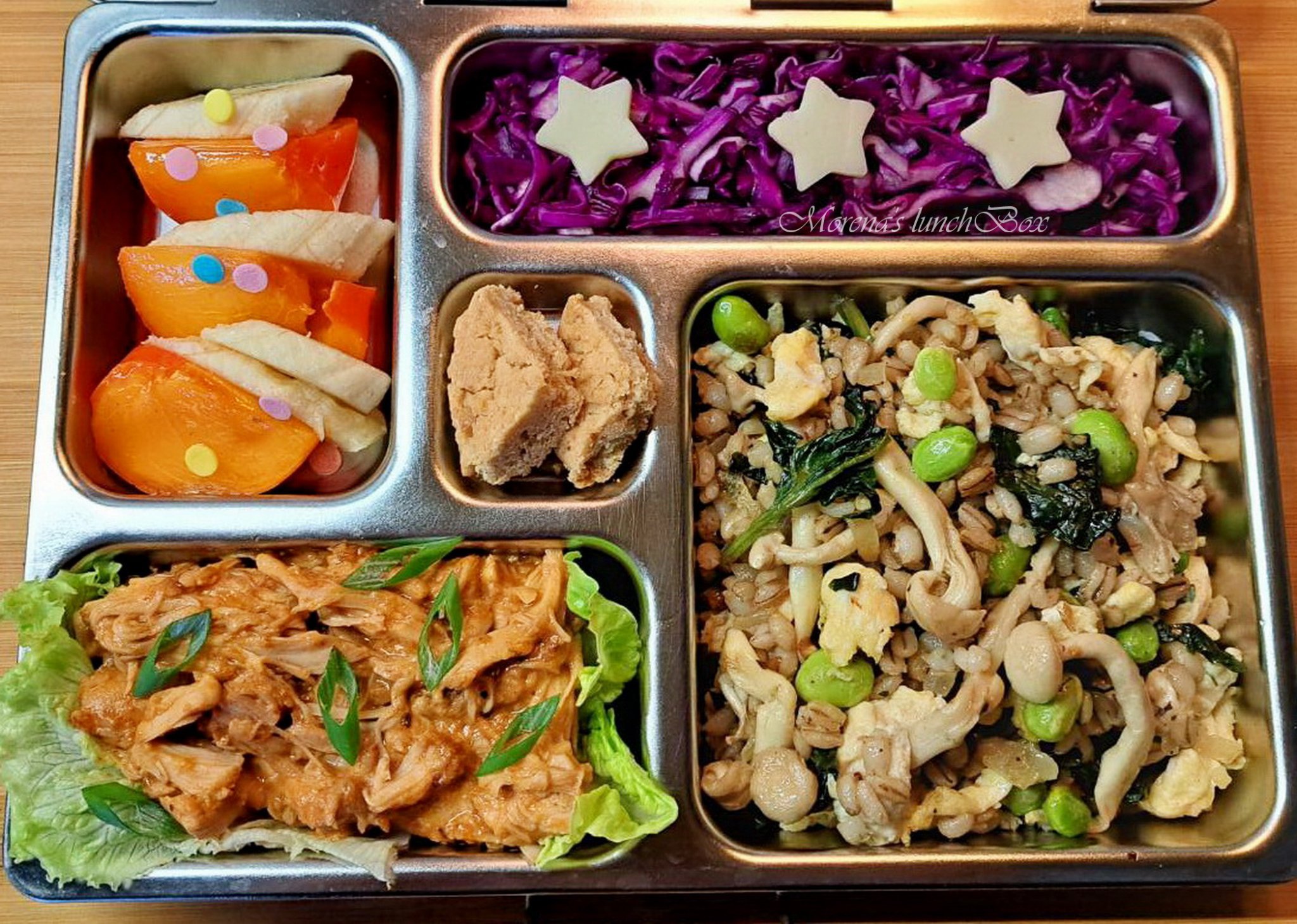 Вчерашната кутия на щерката - Перлен ечемик, със спанак, яйце и гъби Шимеджи по азиатски;  дърпано пилешко, което доовкусих със соев сос, настърган джинджифил и сусамово олио; червено зеле със сусамово олио;