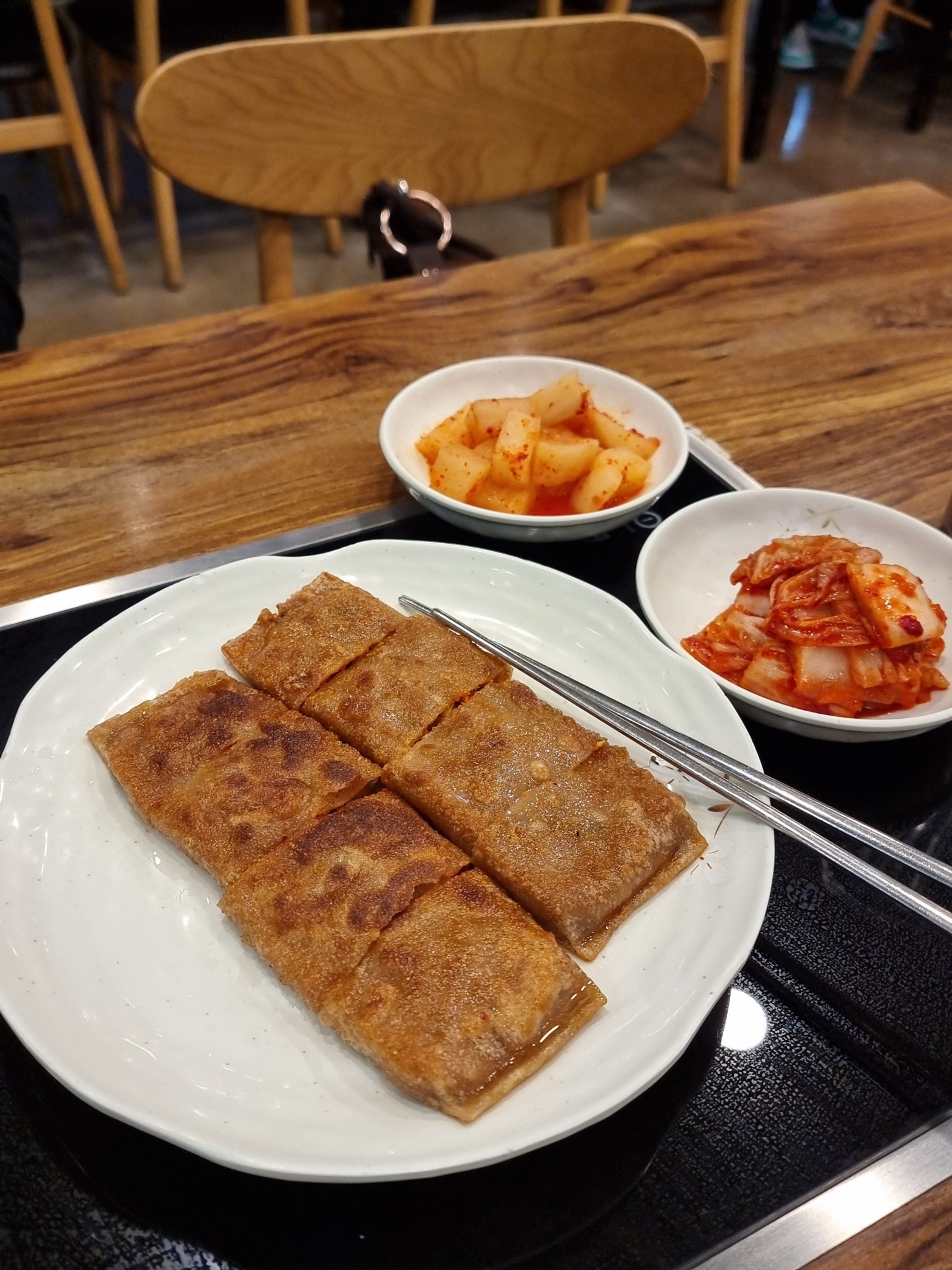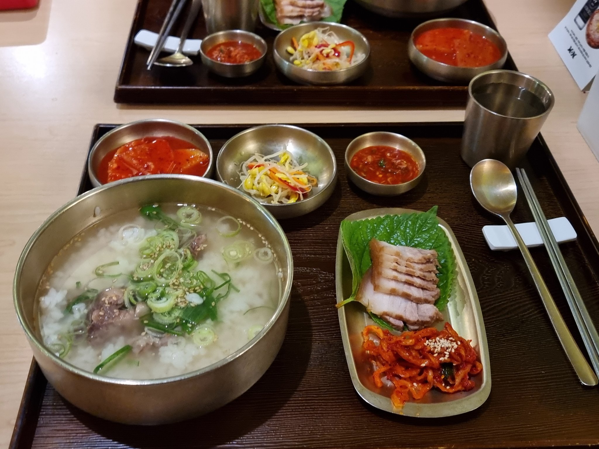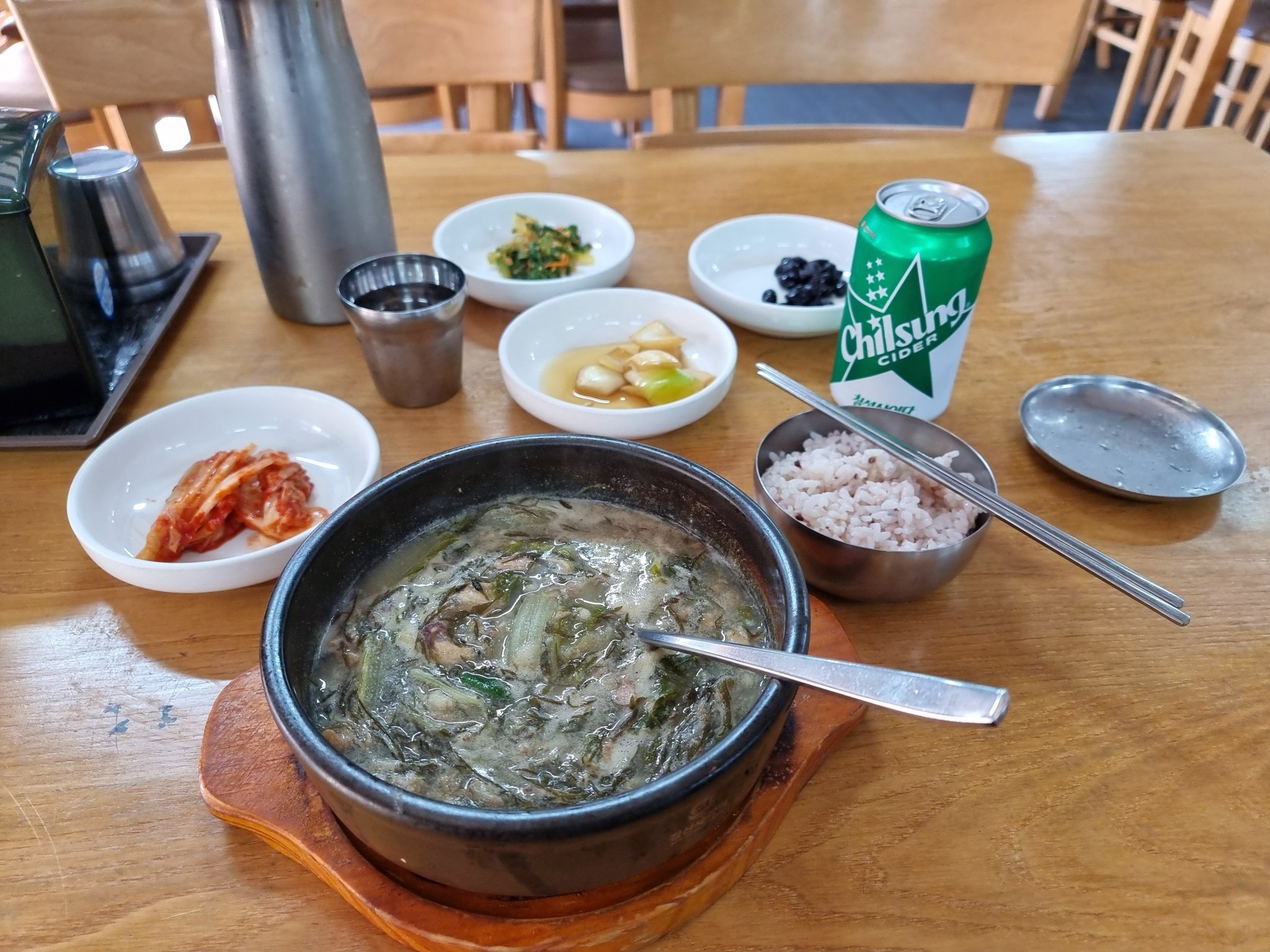 - първото ядене на корейска земя, на летището Гимпо, докато си чаках полета за остров Чеджу. Така и не разбрах какво си поръчах, понеже нямаше меню на английски и се ориентирах по картинките на дисплея. Накратко, беше супа с месо и нещо като омлет, ориз и няколко вида мариновани зеленчуци (банчан). Беше много вкусно, или поне на мен ми се видя така след 12-часов полет и още поне 4-5 часа висене по летища.